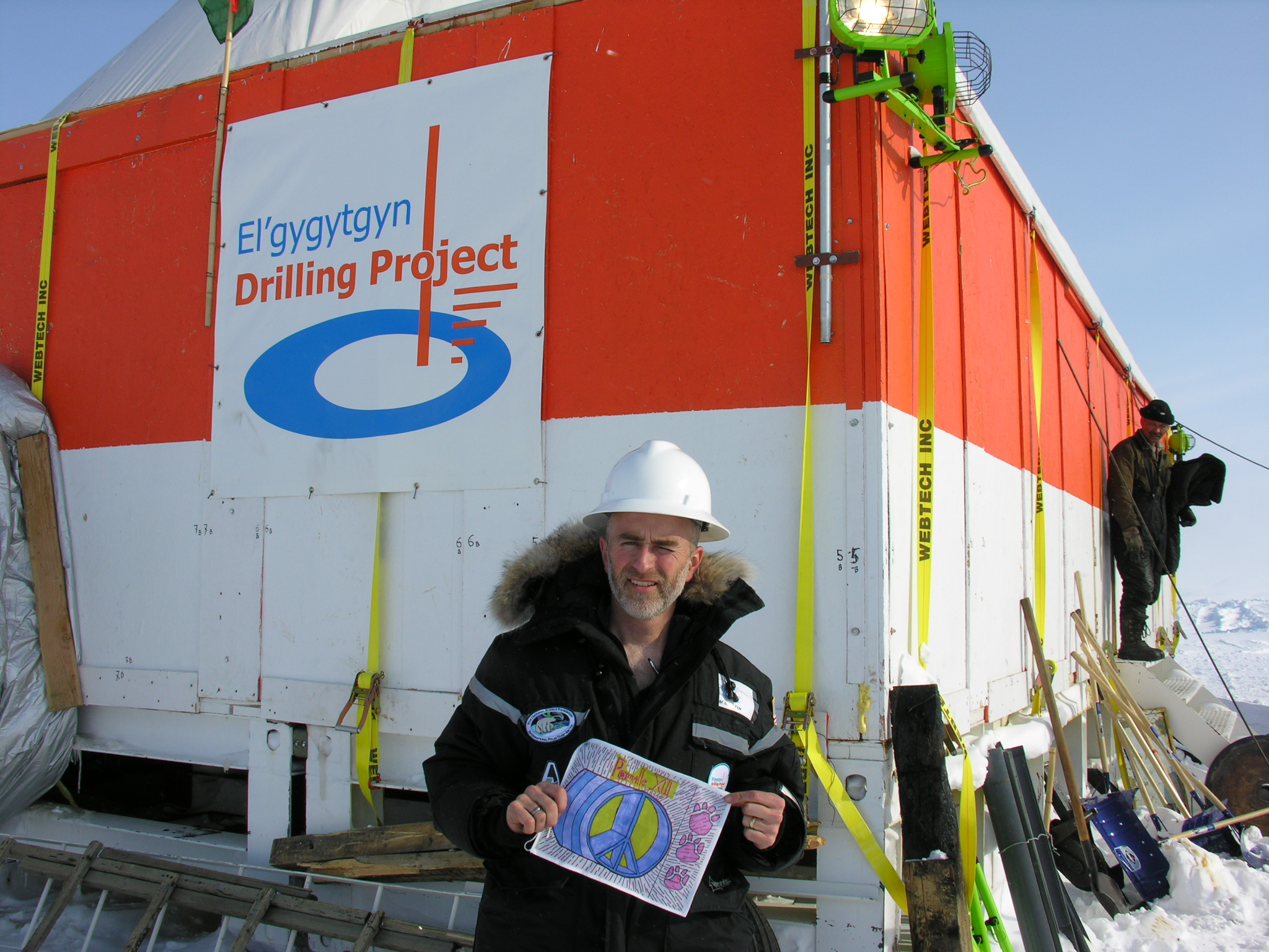 Tim Martin holds Mr. Andrews' Pawville class flag at the drilling site at Lake El'gygytgyn, Chukotka, Russia.