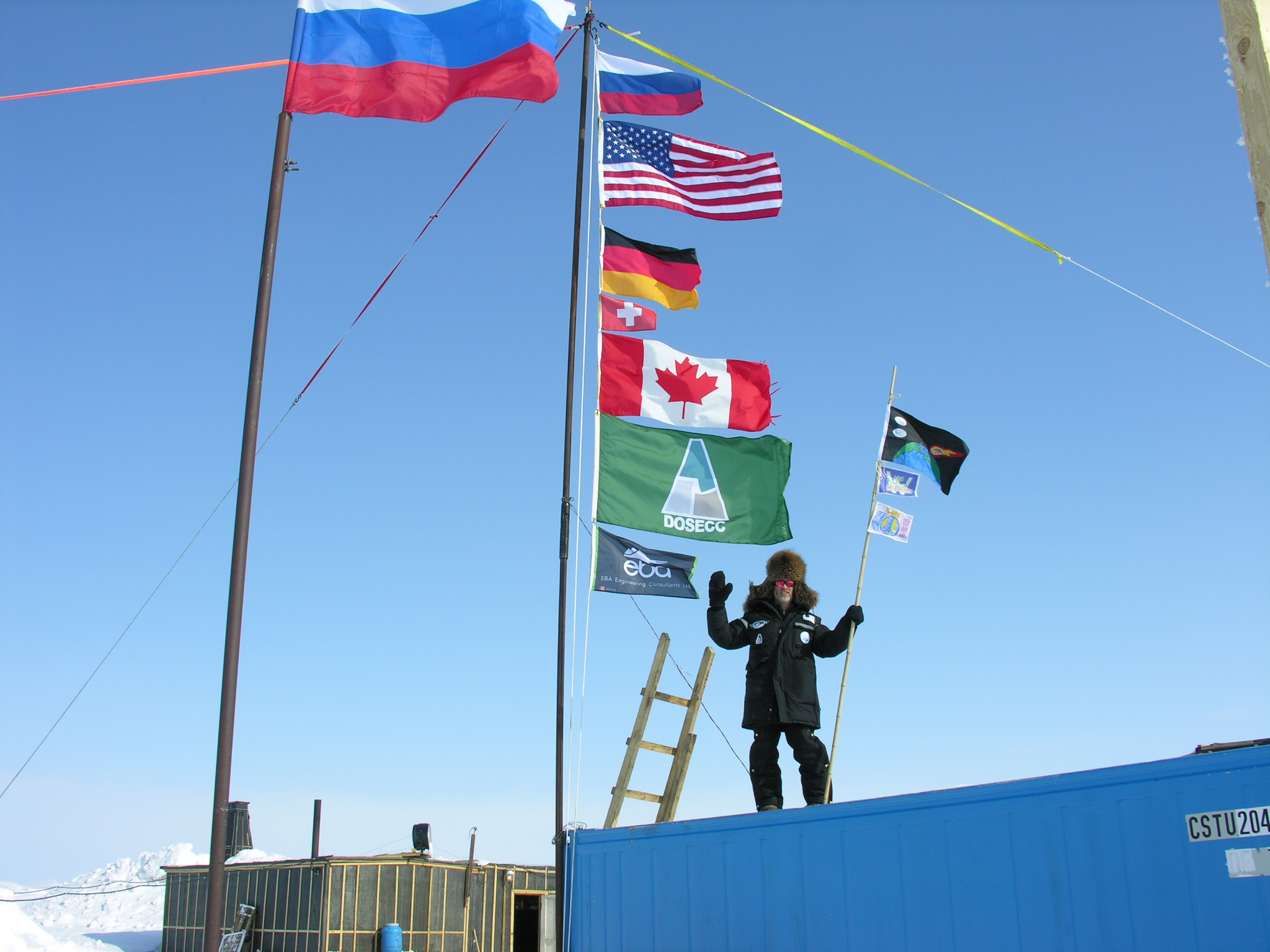 Tim Martin poses with expedition flags and school flags at Camp El'gygytgyn, Chukotka, Russia.