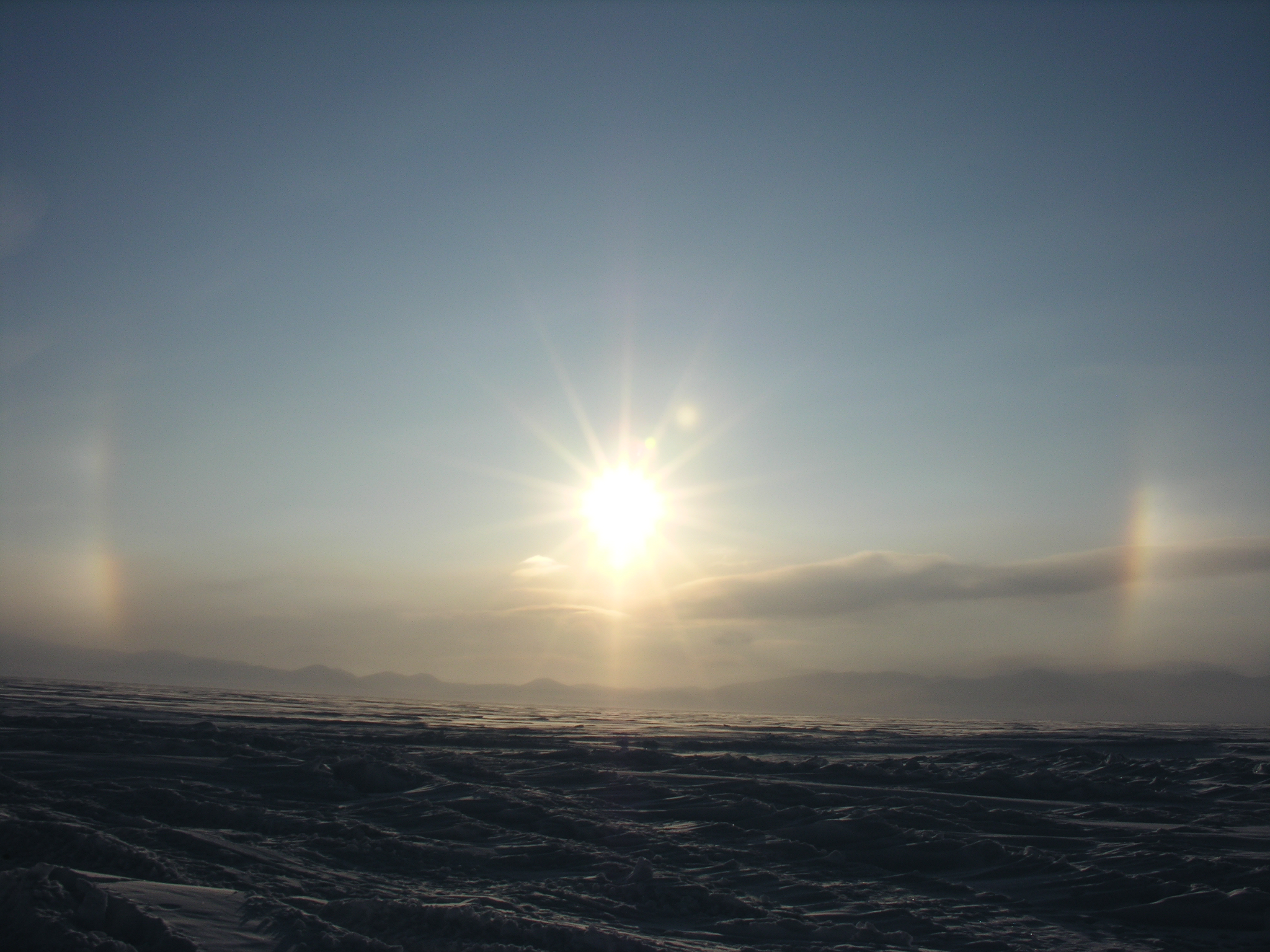 Diamond dust and blowing snow form sun dogs around the sun. At the drilling site at Lake El'gygytgyn, Chukotka, Russia.