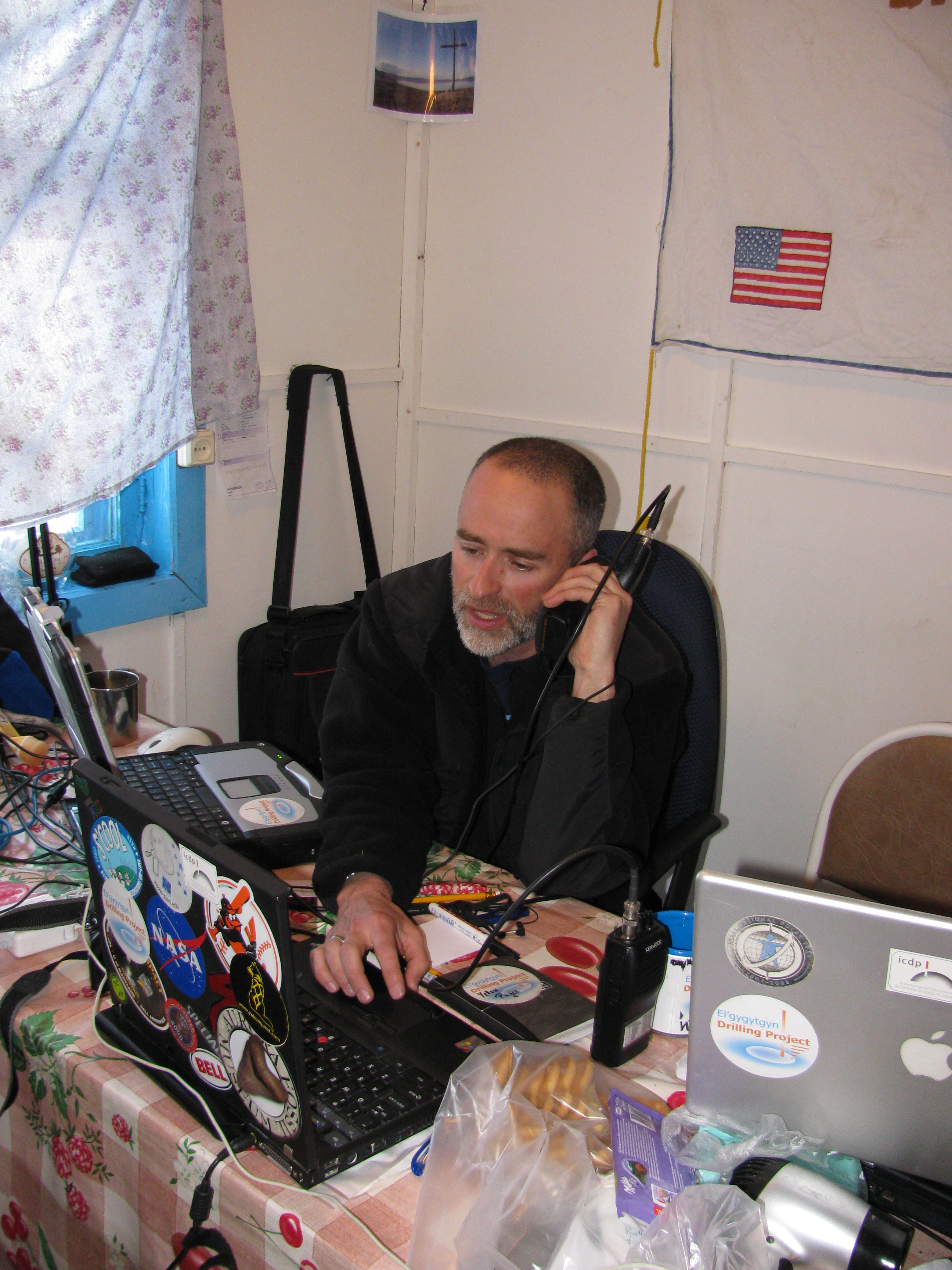 Tim Martin manages computers and a satellite phone during a webcast from Camp El'gygytgyn, Chukotka, Russia.