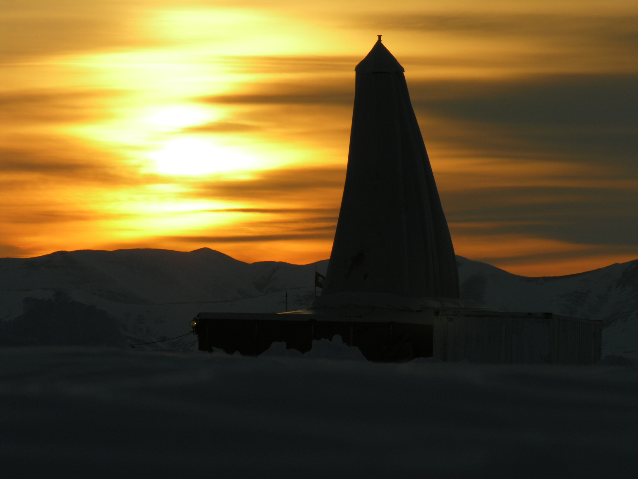 Sunset over the Lake El'gygytgyn drill rig as Tim Martin begins the night shift. At the drilling site at Lake El'gygytgyn, Chukotka, Russia.