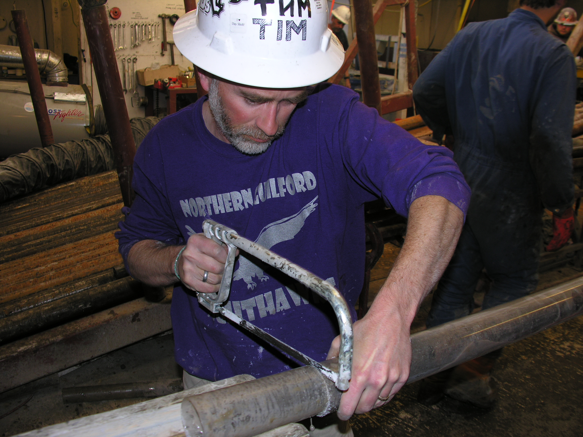 Tim Martin has the privilege of cutting the first impact breccia cores. At the drilling site at Lake El'gygytgyn, Chukotka, Russia.