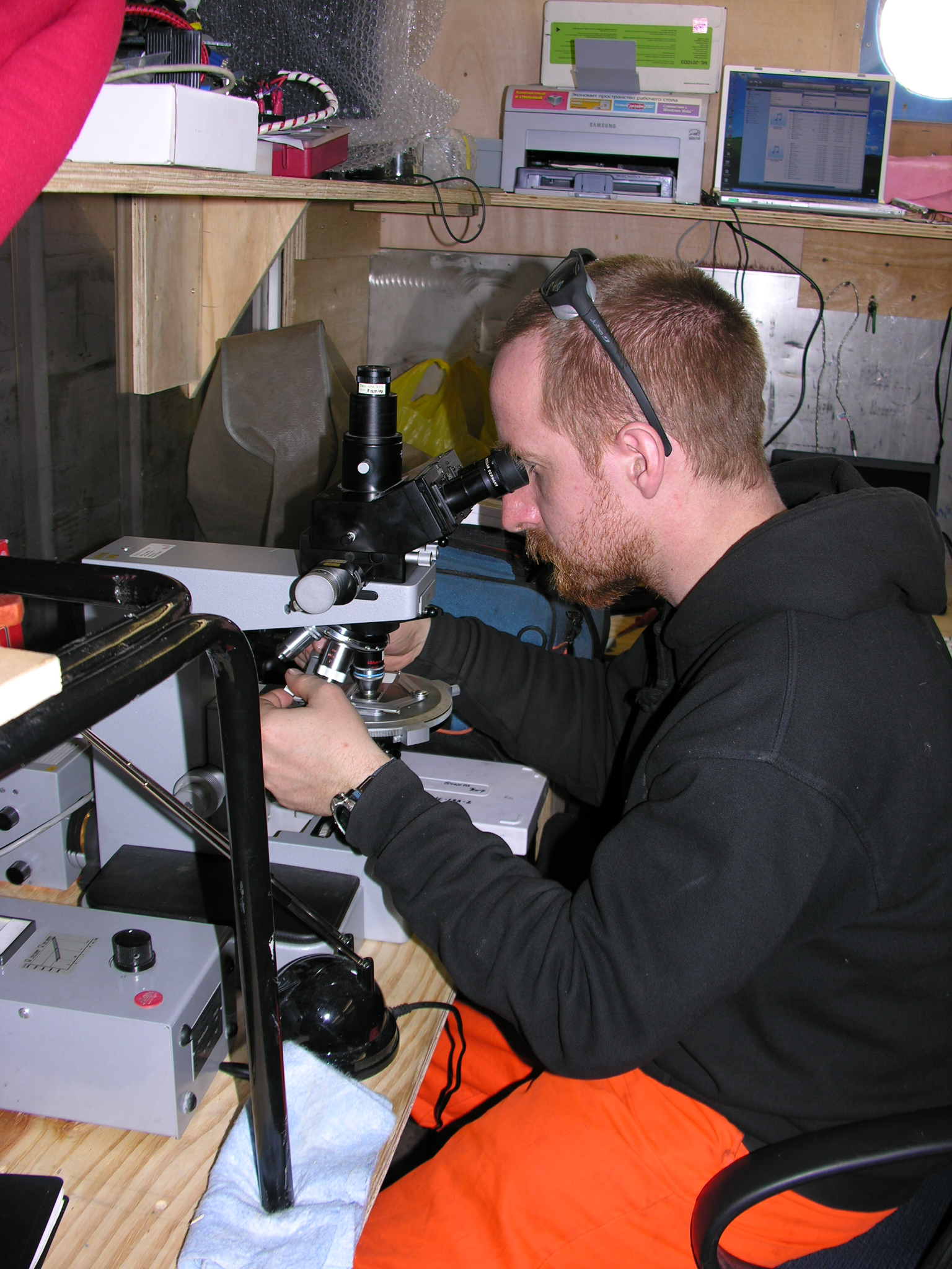 Volker Wennrich of Germany at the microscope in the lab. Camp El'gygytgyn, Chukotka, Russia.