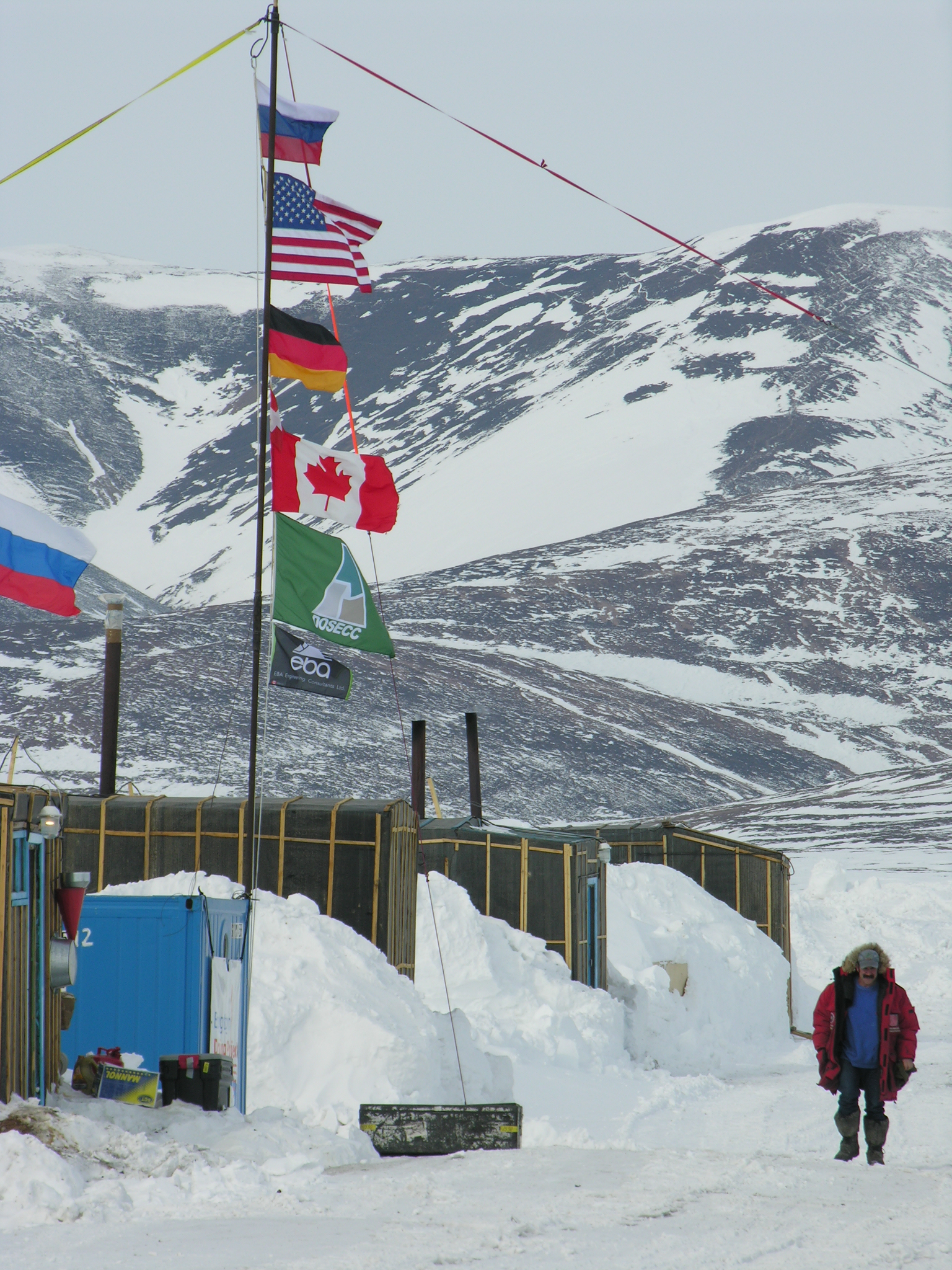 Tim Martin: "The flagpole in camp symbolizes the international nature of our expedition." Camp El'gygytgyn, Chukotka, Russia.