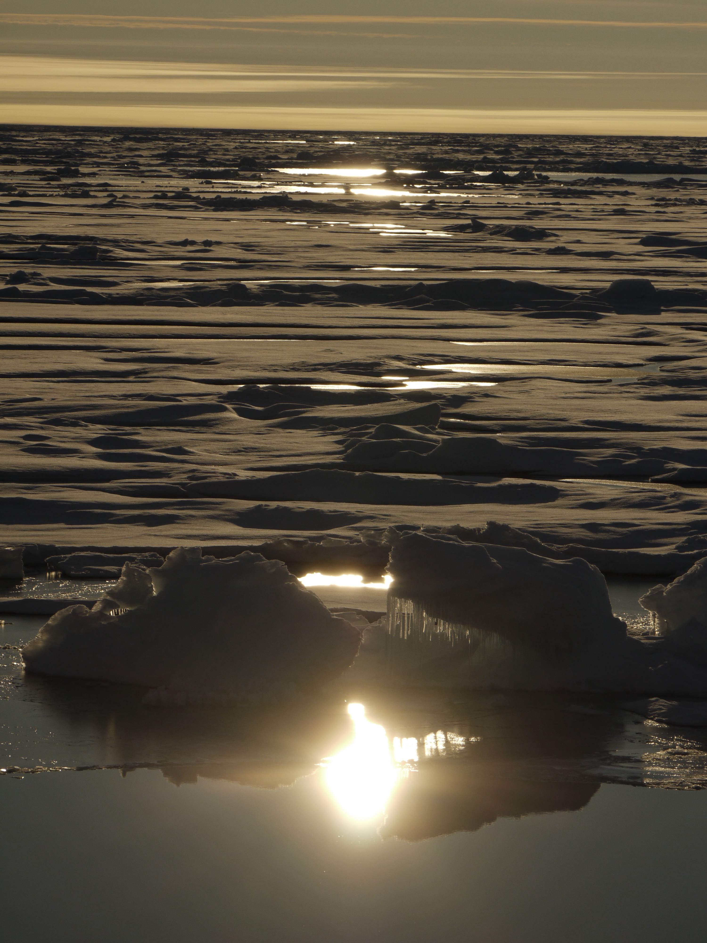 Bill Schmoker: "We haven't had a sunset for a while now (we're too far north for that now at this time of year), but the sun still dips low enough in the sky for some dramatic lighting on the ice." Aboard the USCGC Healy icebreaker in the Arctic Ocean.