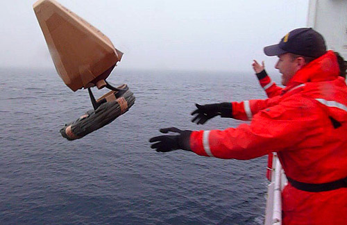 A drift buoy is deployed in the Beaufort Sea off the side of the Healy. Aboard the USCGC Healy icebreaker in the Beaufort Sea.