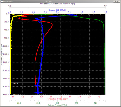 Data plots from the August 9, 2010 CTD (conductivity, temperature, and depth probe) that was cast in the Beaufort Sea. Depth is on the y-axis from 0 to 3000 meters deep. Yellow is a fluorescence value to indicate chlorophyl levels, red is temperature, blue is dissolved oxygen, and green is salinity, as determined by electrical conductivity.