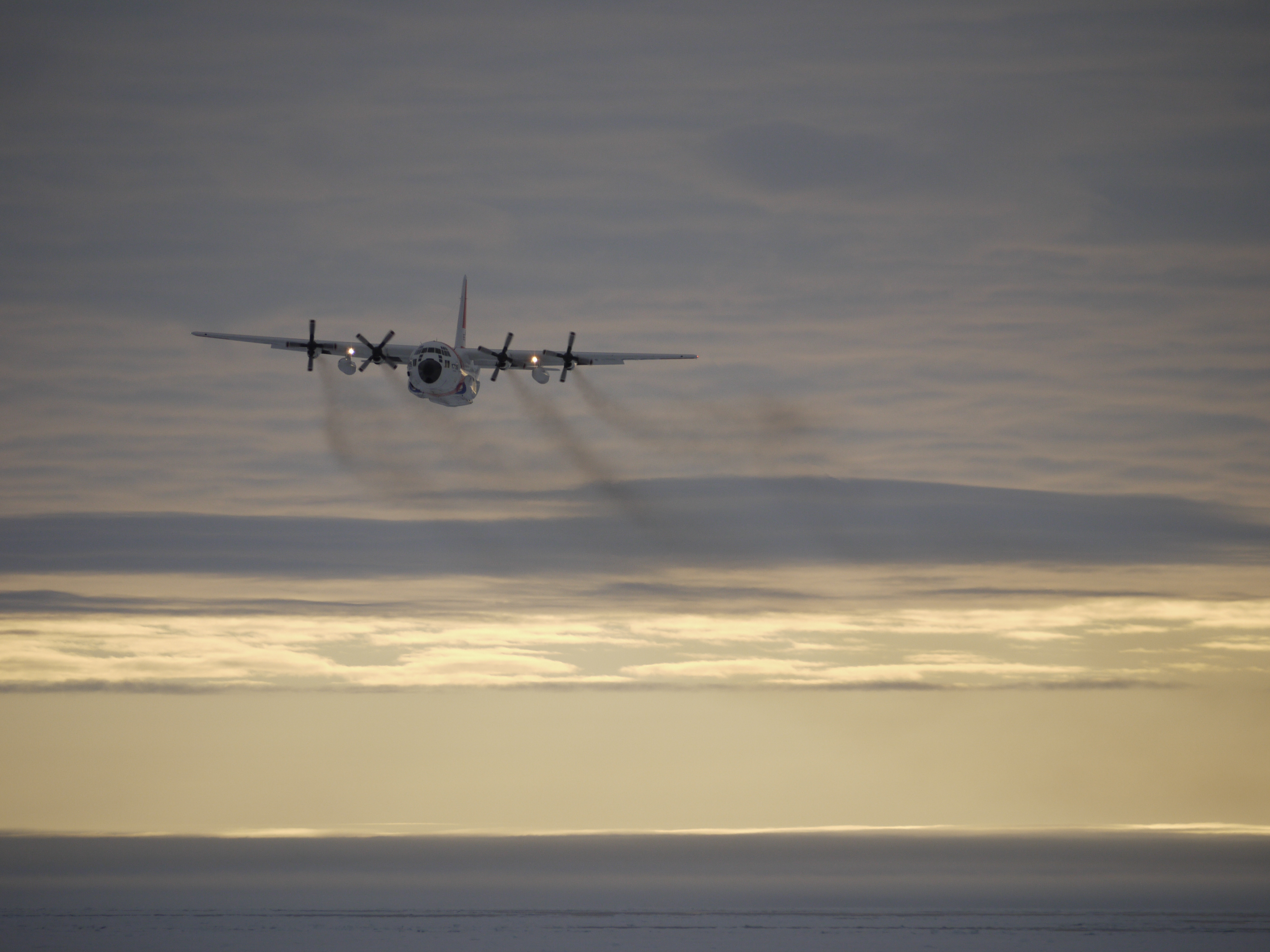 A US Coast Guard C-130 transport plane from Kodiak, Alaska approaches the CCGS Louis S. St-Laurent and the Healy from the southwest, saluting the ships with its landing lights on. Aboard the USCGC Healy icebreaker in the Arctic Ocean.