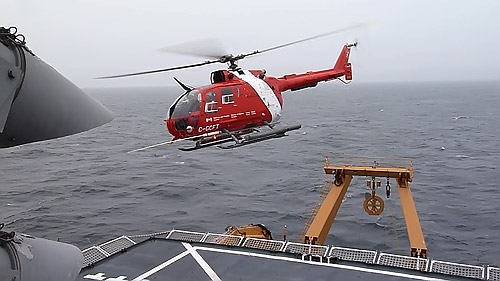 The helicopter takes off to ferry passengers and gear across to the CCGS Louis S. St-Laurent. Aboard the USCGC Healy icebreaker on the Beaufort Sea.