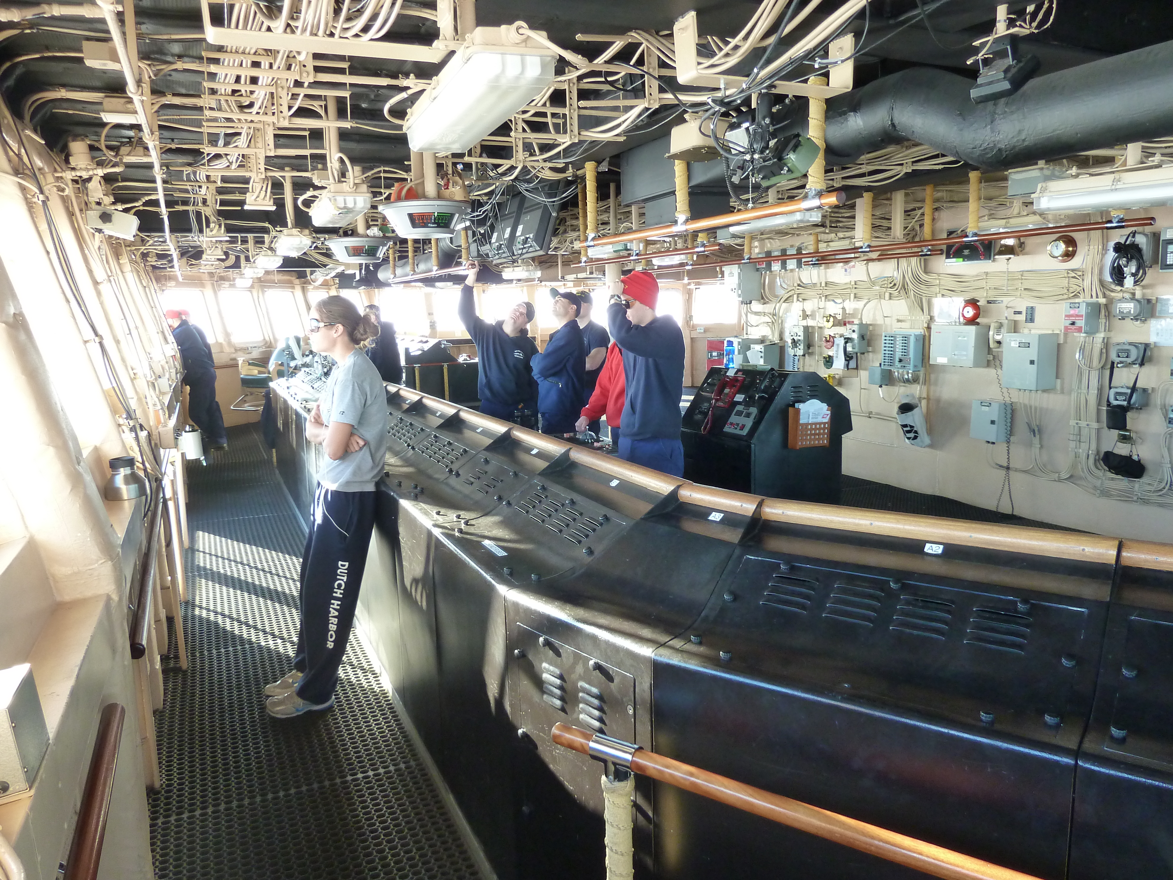The bridge on the USCGC Healy icebreaker. Bridge officers are behind the console to port while Sarah Ashworth, one of the Marine Mammal Observers, watches from the front of the bridge. Aboard the USCGC Healy icebreaker in the Arctic Ocean.