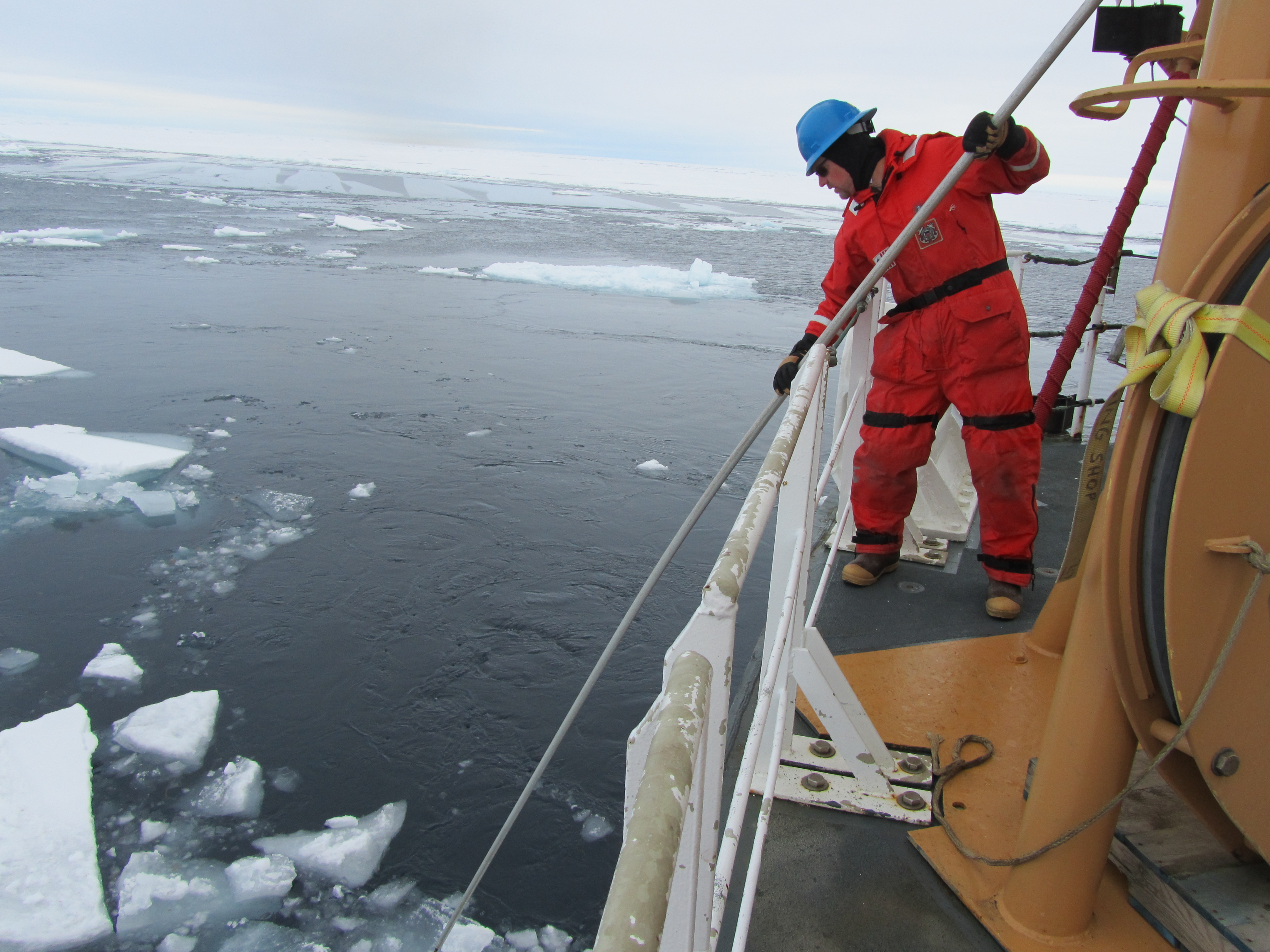 Bill wields an ice pole to push off loose blocks of sea ice that threaten to interfere with the coring operations. Aboard the USCGC Healy icebreaker on the Arctic Ocean.