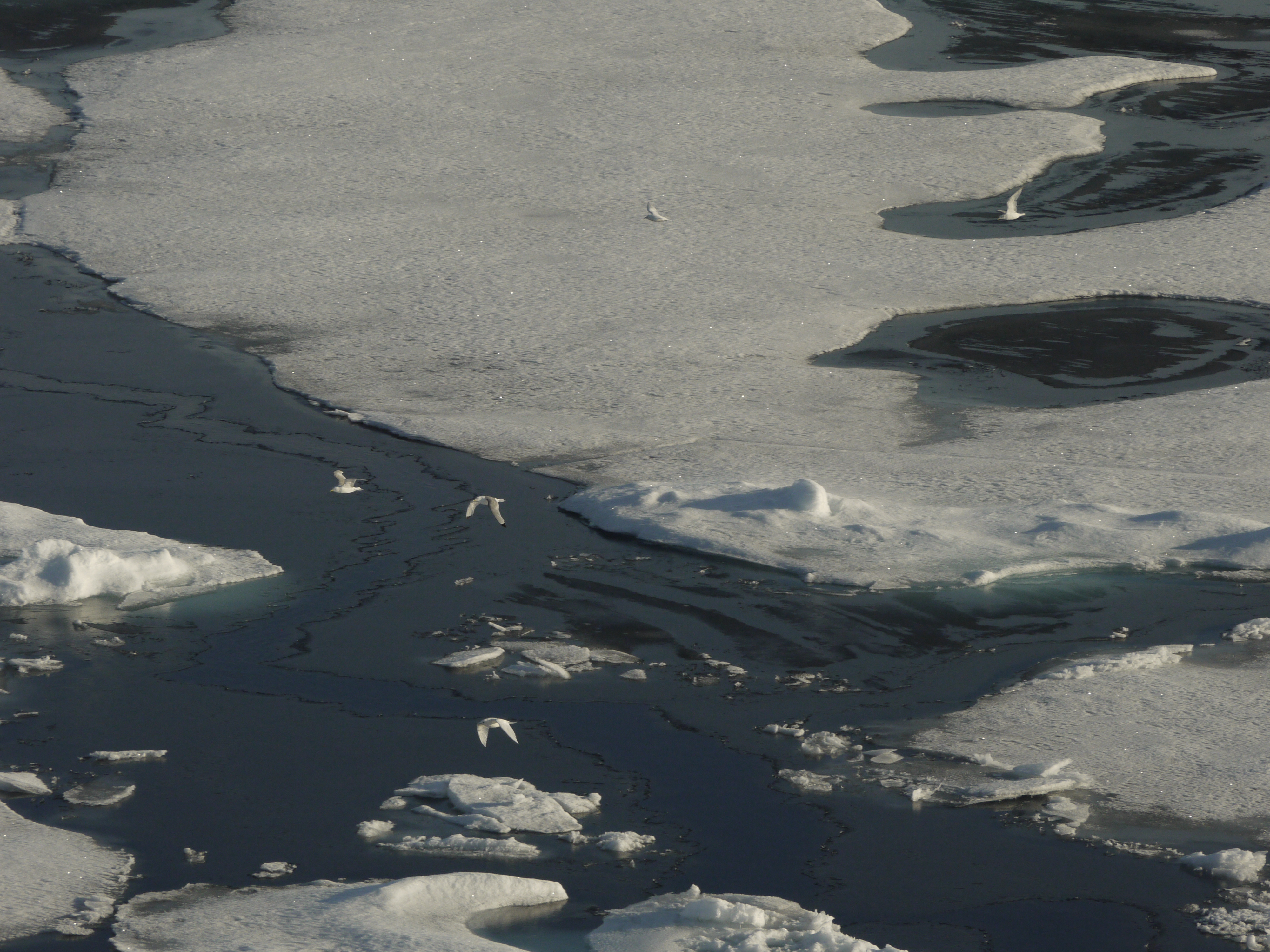 An Ivory Gull (bottom) with two Black-legged Kittiwakes as seen from the bridge of the Healy. Aboard the USCGC Healy icebreaker in the Arctic Ocean.