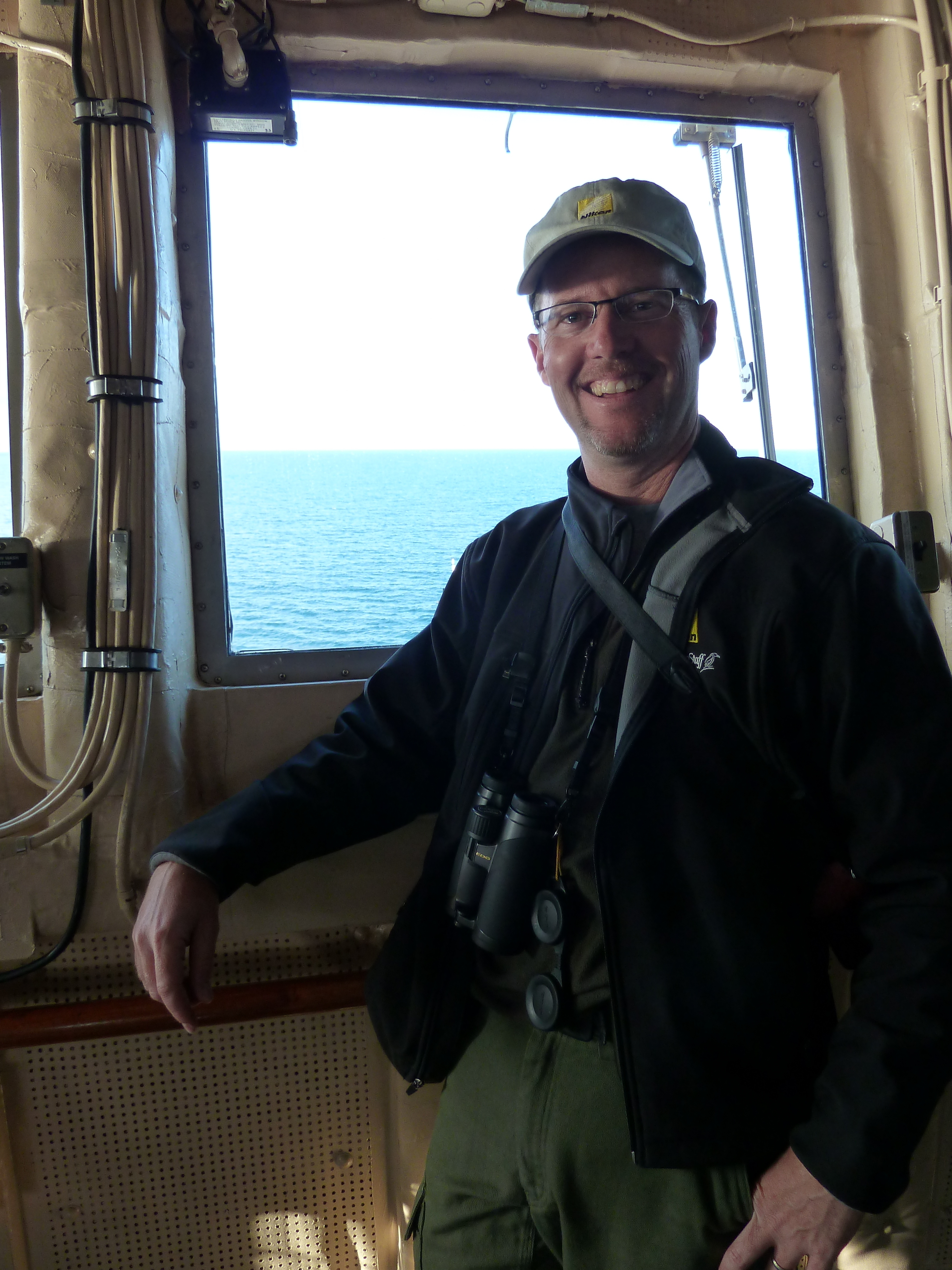 Bill Schmoker on the bridge of the Healy as the ship crossed the Arctic Circle into the Chukchi Sea. Aboard the USCGC Healy icebreaker in the Chukchi Sea, just north of the Bering Strait.