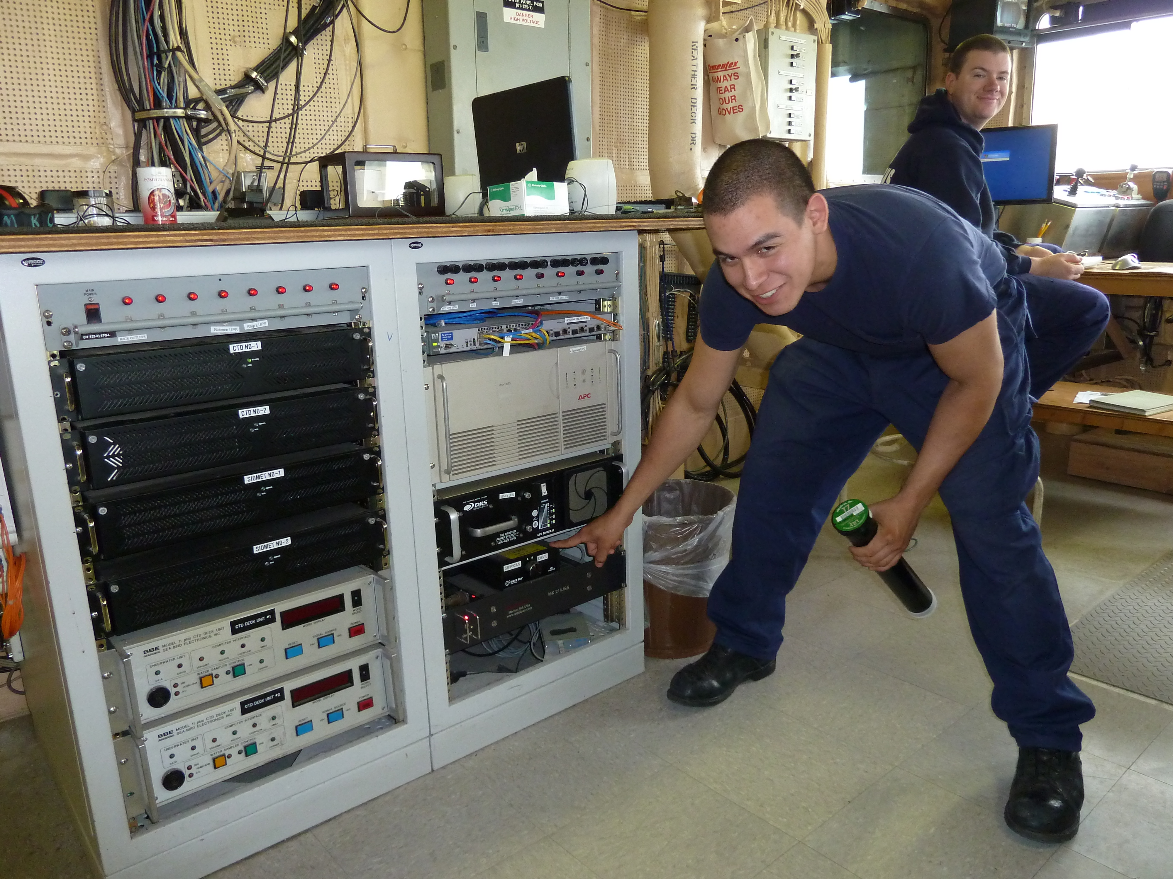 Marine Science Technician Marshal Chaidez explains the XBT instrument (expendable bathythermograph) and the computer system that records the data sent back from the water column. Aboard the USCGC Healy icebreaker in Beaufort Sea northwest of the Mackenzie River delta.