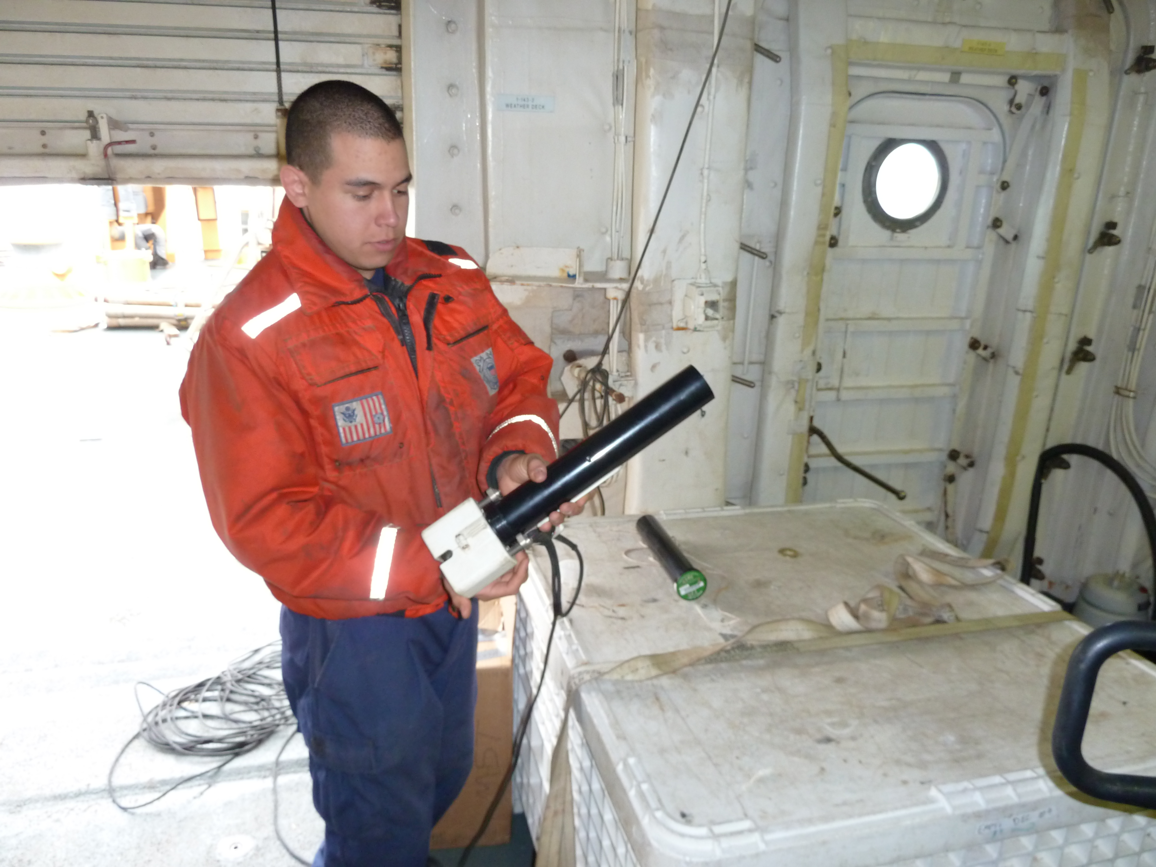 The XBT (expendable bathythermograph) is placed into the launcher, which is connected via a cable to a computer which records the data. A pin holds the XBT in place until it is time to send it overboard. Aboard the USCGC Healy icebreaker in Beaufort Sea northwest of the Mackenzie River delta.