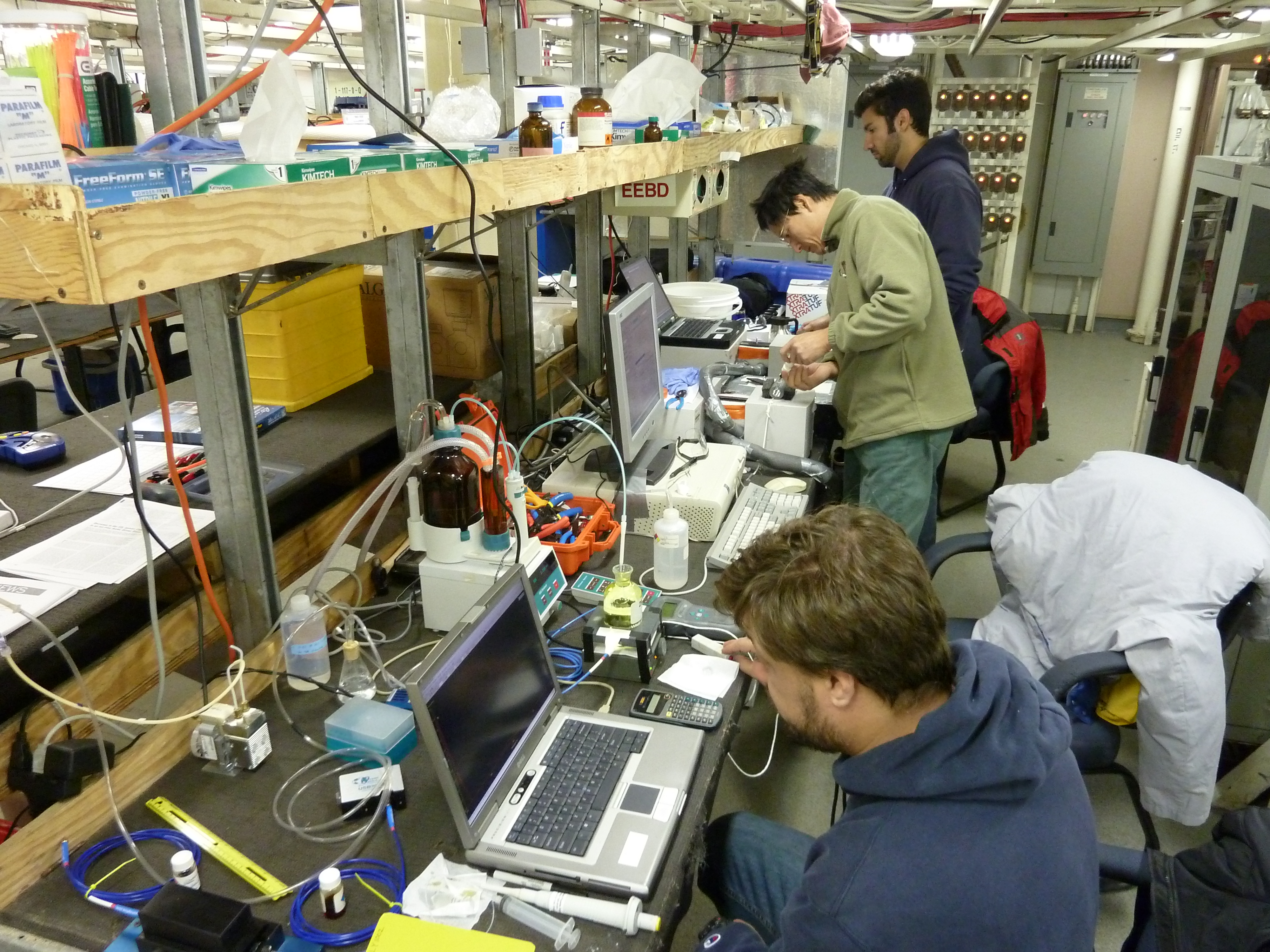Chris (foreground), Sherwood (middle), and Mark (back) work with their water chemistry analysis equipment in one of the ship's science labs. Aboard the USCGC Healy icebreaker in the Beaufort Sea.