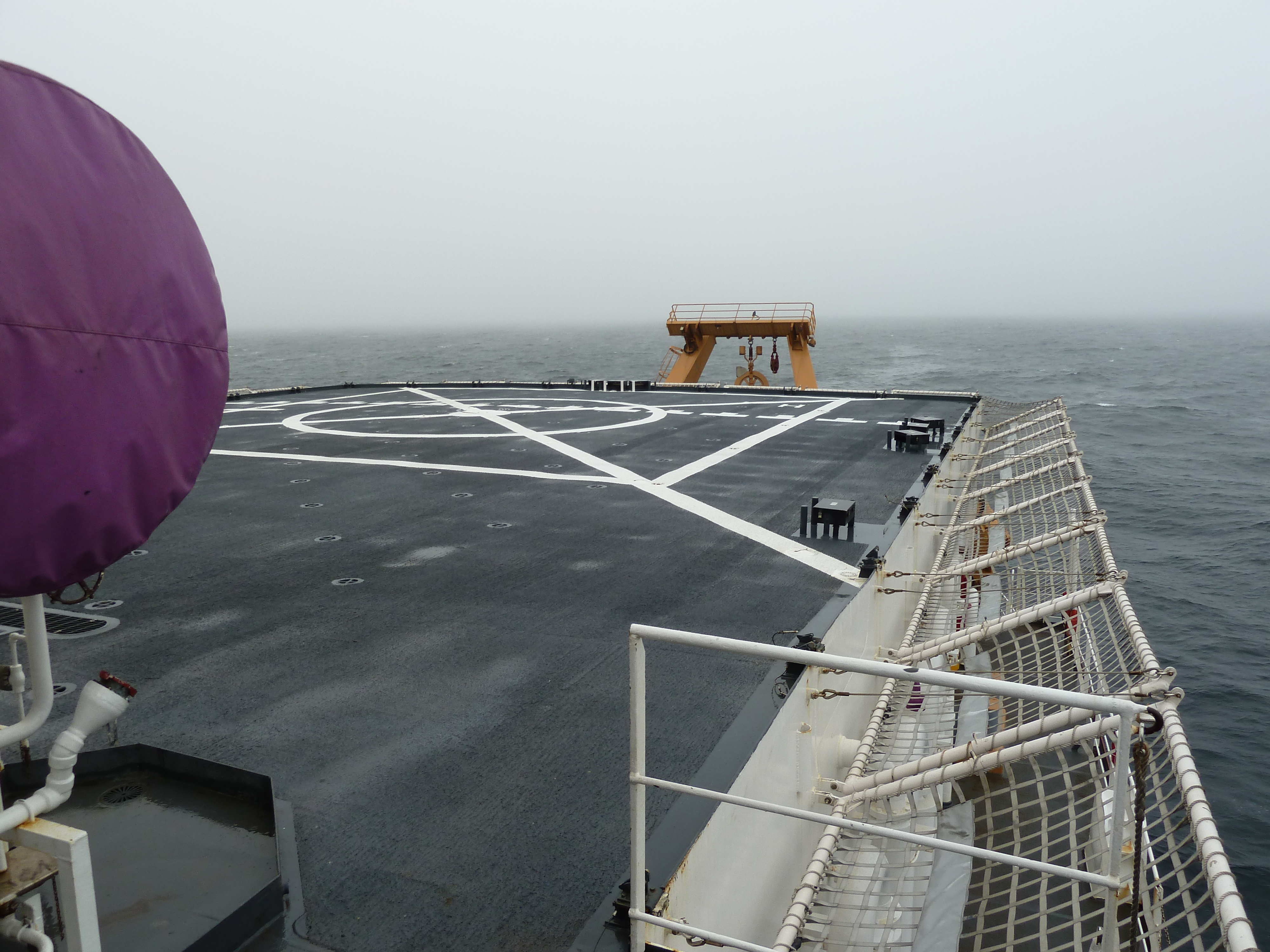 The helicopter deck is readied for flights with the netting down. In ordinary situations the netting is vertical, acting like a guard rail. The purple cover on the left side is a hose reel for fueling helicopters. Any pipe, valve, filter, or item related to helicopter fuel is this color to avoid confusion with the ship's diesel fuel systems. Aboard the USCGC Healy icebreaker in the Beaufort Sea.