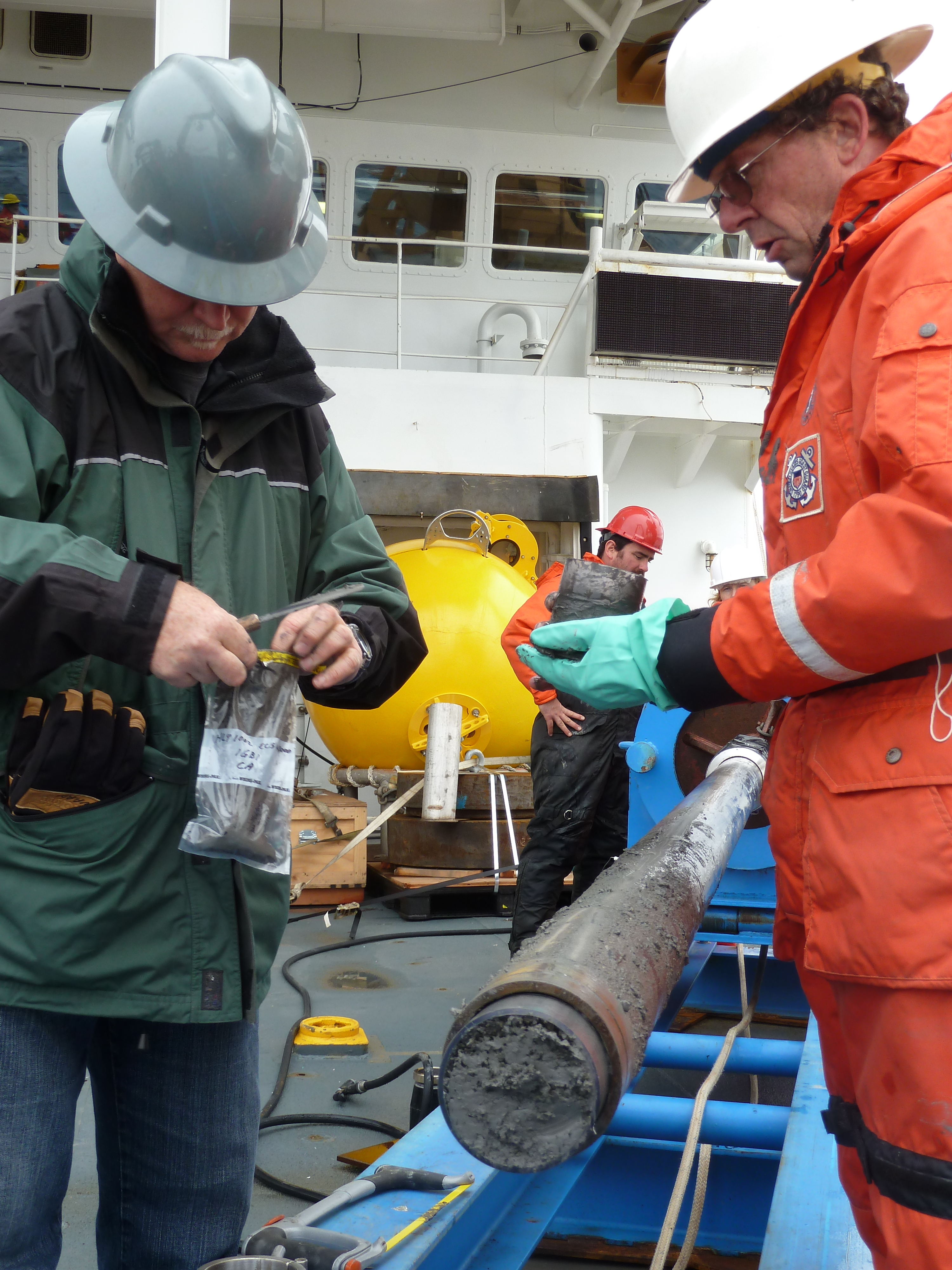 Brian Edwards and Andy Stevenson recover samples from the core cutter and core catcher before removing the plastic lining holding the main core sample. Aboard the USCGC Healy icebreaker in the Beaufort Sea.