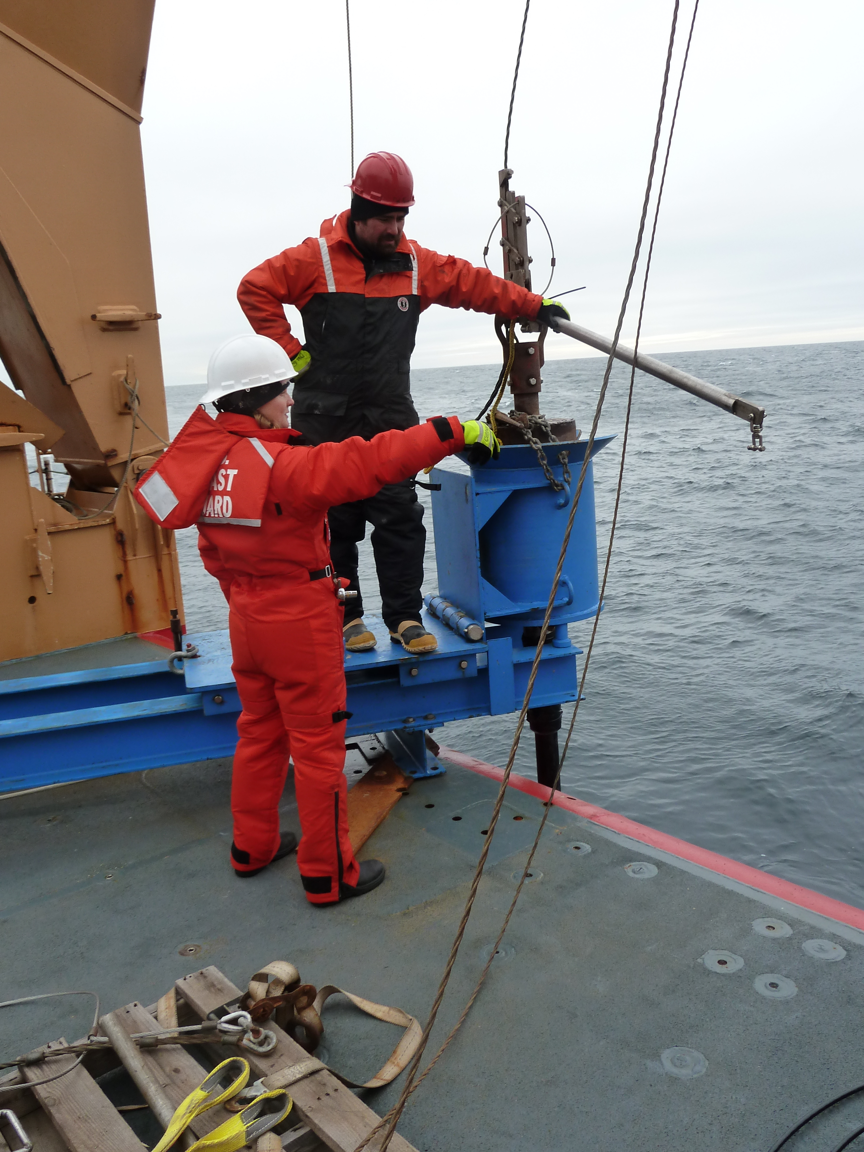 Bill Schmoker: "Here we see the tripping arm ready to receive the trigger weight. Note the coil of slack wire over Pete's arm." Aboard the USCGC Healy icebreaker in the Beaufort Sea.