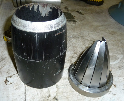 Prior to deployment a core catcher (right) is put in the tip of the steel coring pipe with the flexible fingers pointing up. Then the core cutter (left) is attached to the end of the pipe, completing the coring rig. Samples are taken from both items as they are removed from the coring pipe before the main core is recovered. Aboard the USCGC Healy icebreaker in the Beaufort Sea.