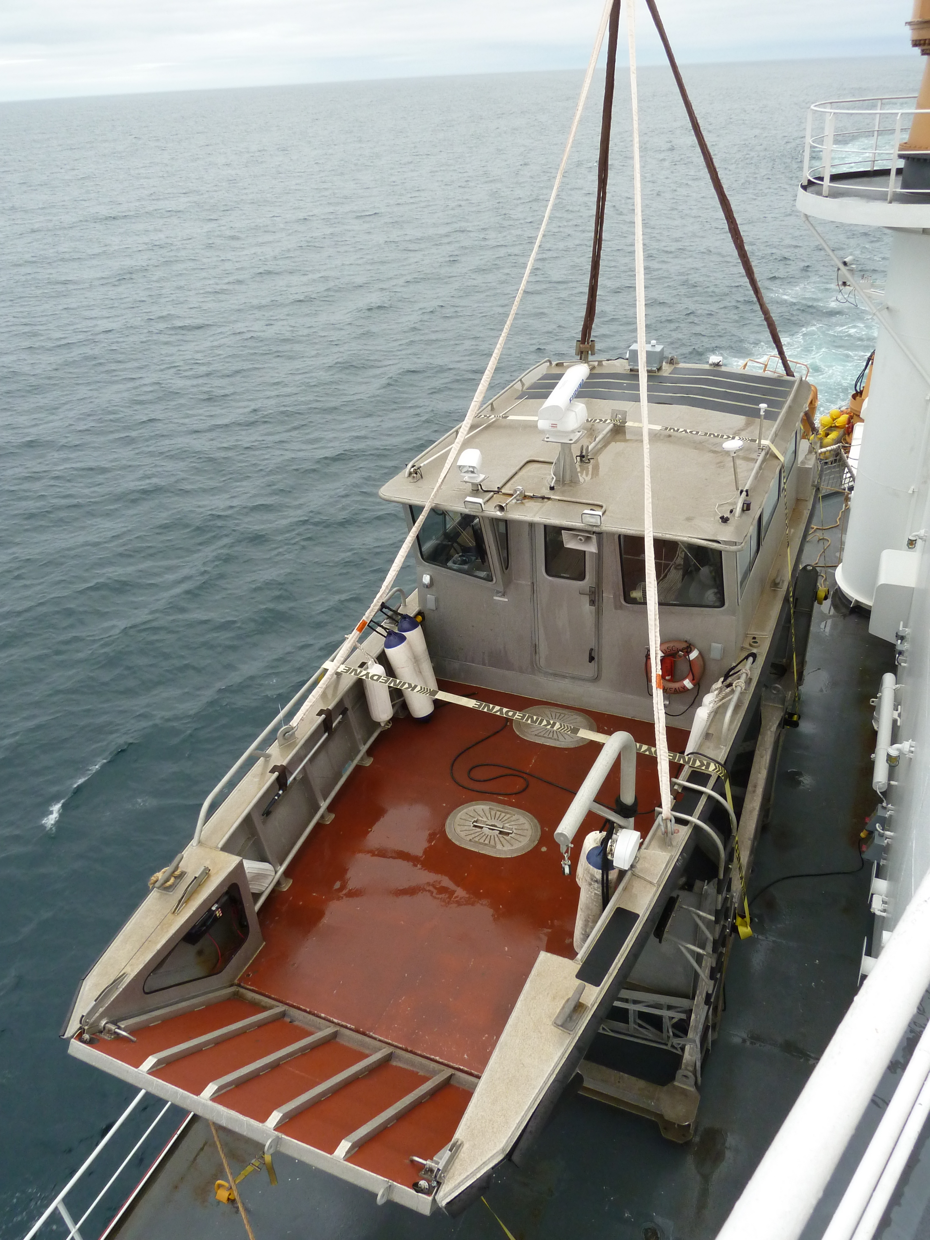 The ASB (Arctic Service Boat) is ready to lift off its cradle on the 02 deck. Note the flat bow that can be hinged down to act as a loading ramp onshore. Aboard the USCGC Healy icebreaker in the Beaufort Sea.