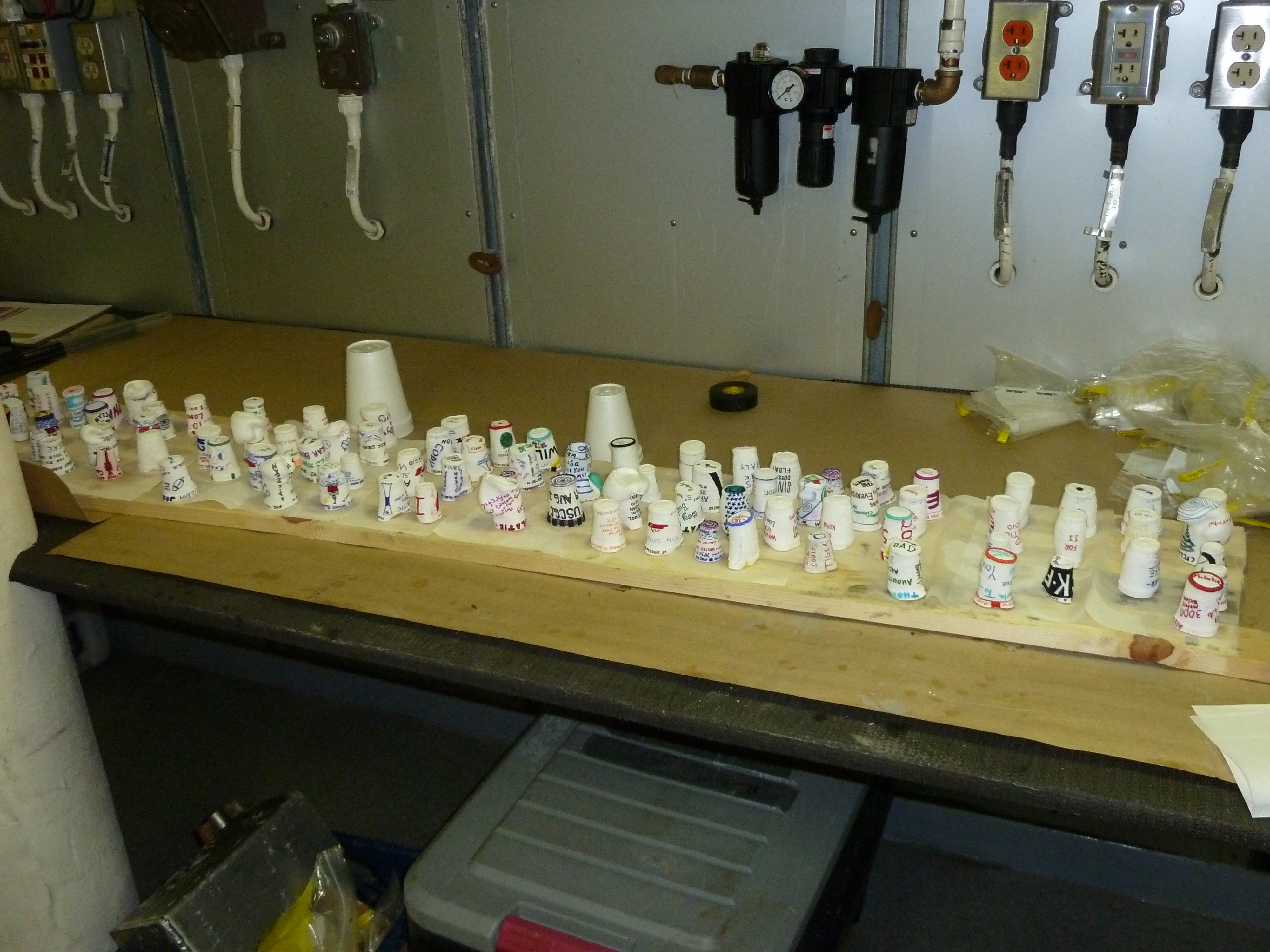 Many of the Healy's crew made personalized styrofoam cups for the ride down on the CTD (conductivity, temperature, depth instrument). Here's a batch sitting with two normal cups behind for size comparison. Aboard the USCGC Healy icebreaker in the Arctic Ocean.