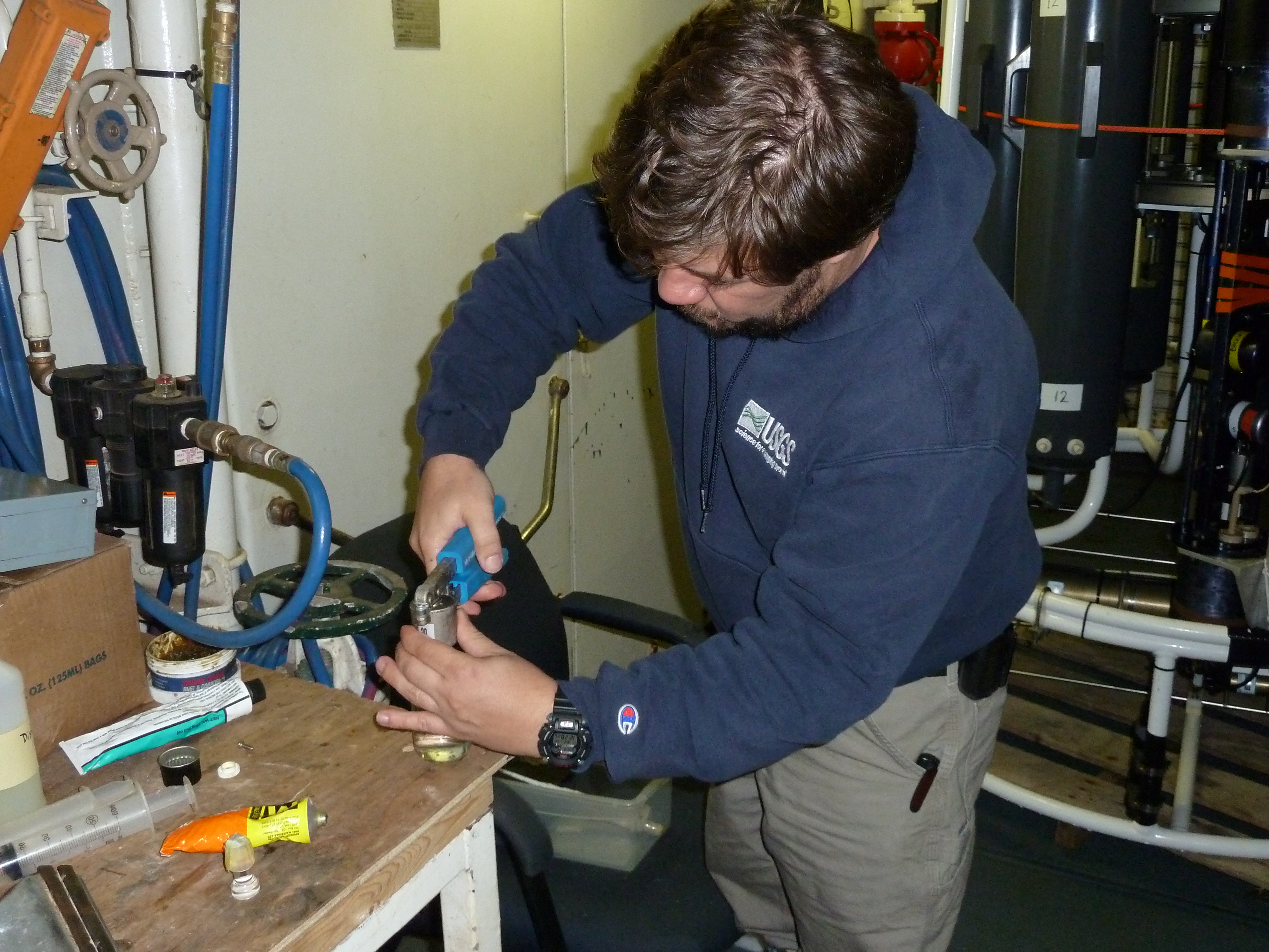 Chris Dufore caps a water sample for storage. It will later undergo isotope analysis. In the starboard staging area, aboard the USCGC Healy icebreaker in the Arctic Ocean.