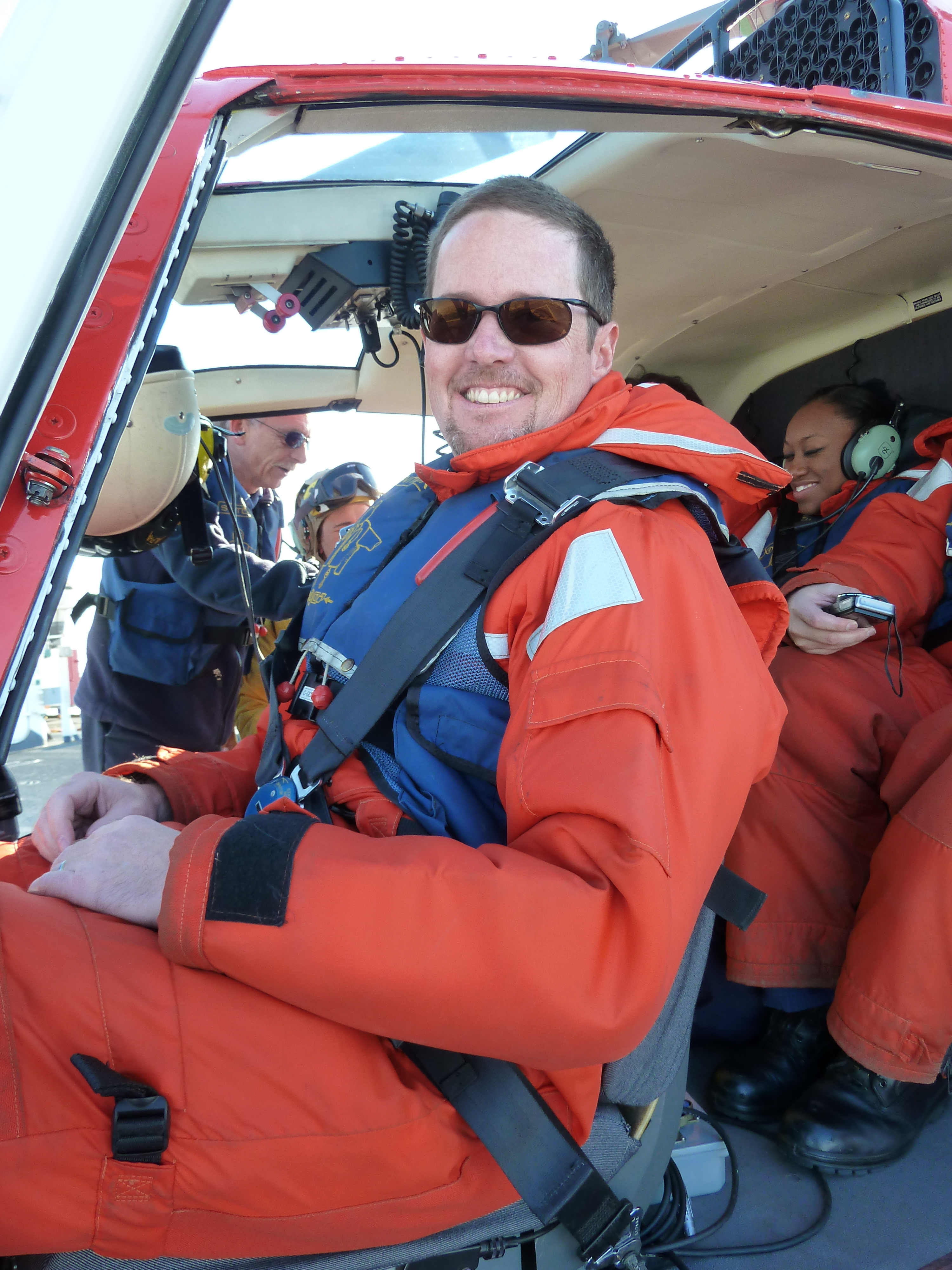 Bill Schmoker sits up front next to the pilot of the helicopter for the flight over to the CCGS Louis S. St-Laurent. In the helicopter, aboard the USCGC Healy icebreaker in the Arctic Ocean.