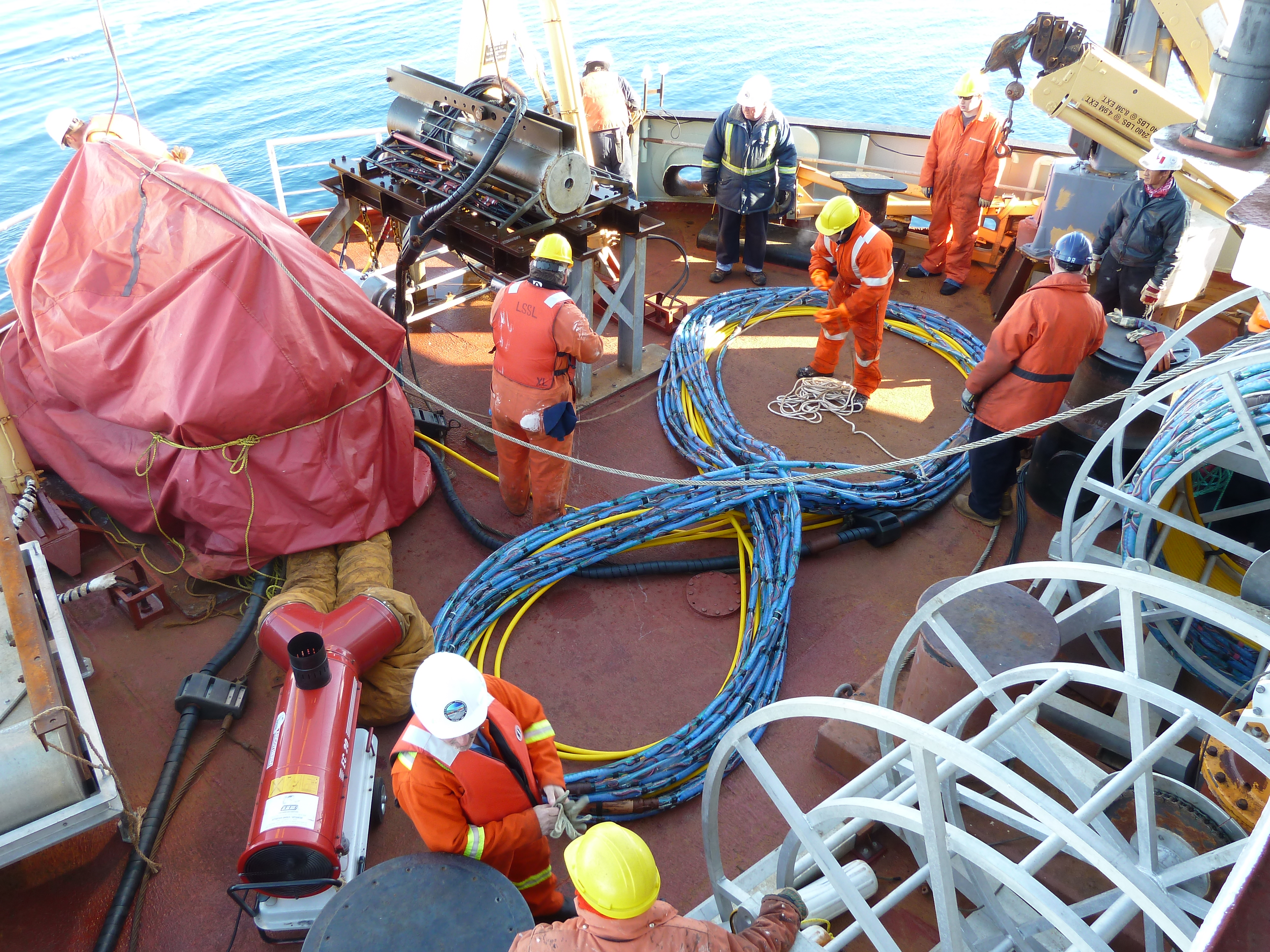 The Louis' seismic streamer is coiled in a figure 8 on the fantail while the sled and air guns are readied for re-deployment. The blue part on top contains the hydrophones and the yellow part below that is a leader that runs between the sled and the streamer. Aboard the CCGS Louis S. St-Laurent in the Arctic Ocean.
