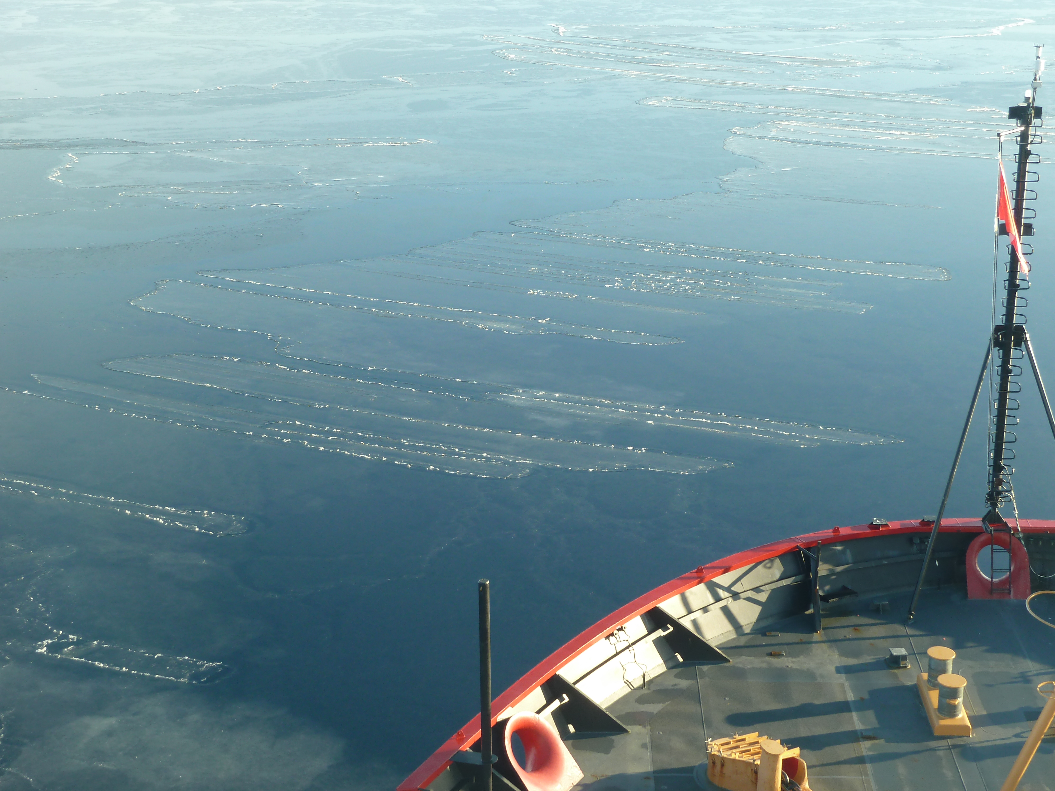 Bill Schmoker: "We periodically went through areas of new ice ... where openings in the multi-year ice were already re-frozen a few inches thick. Much of this new ice featured finger rafting patterns, caused as pressure squeezes the rectangular 'fingers' into overlapping joints." Aboard the USCGC Healy icebreaker in the Arctic Ocean.