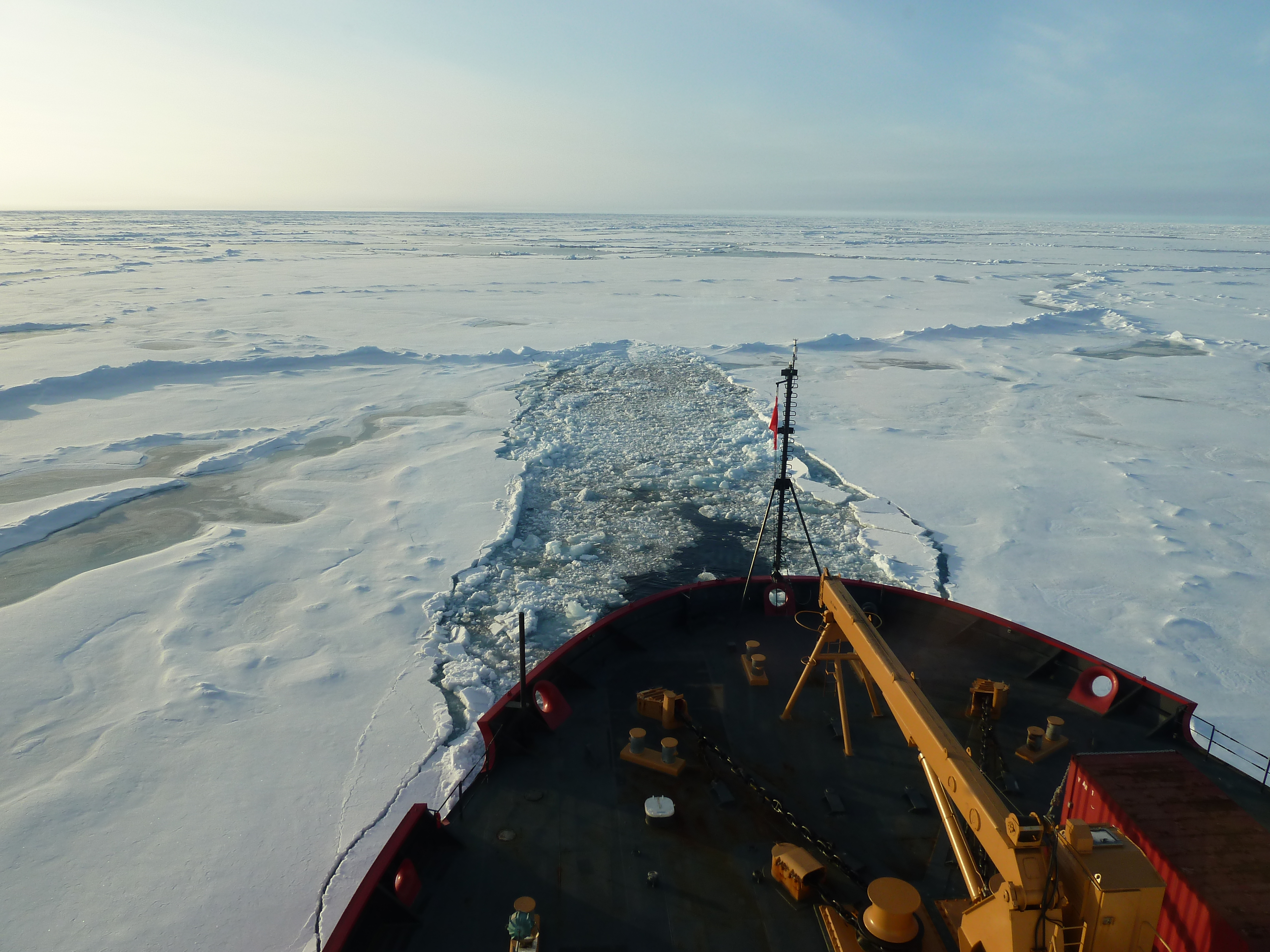 This pressure ridge stopped the Healy in its tracks, but by backing and ramming the Healy could proceed on its way. Note the impression left by Healy's bow on the unbroken ice. Aboard the USCGC Healy icebreaker in the Arctic Ocean.