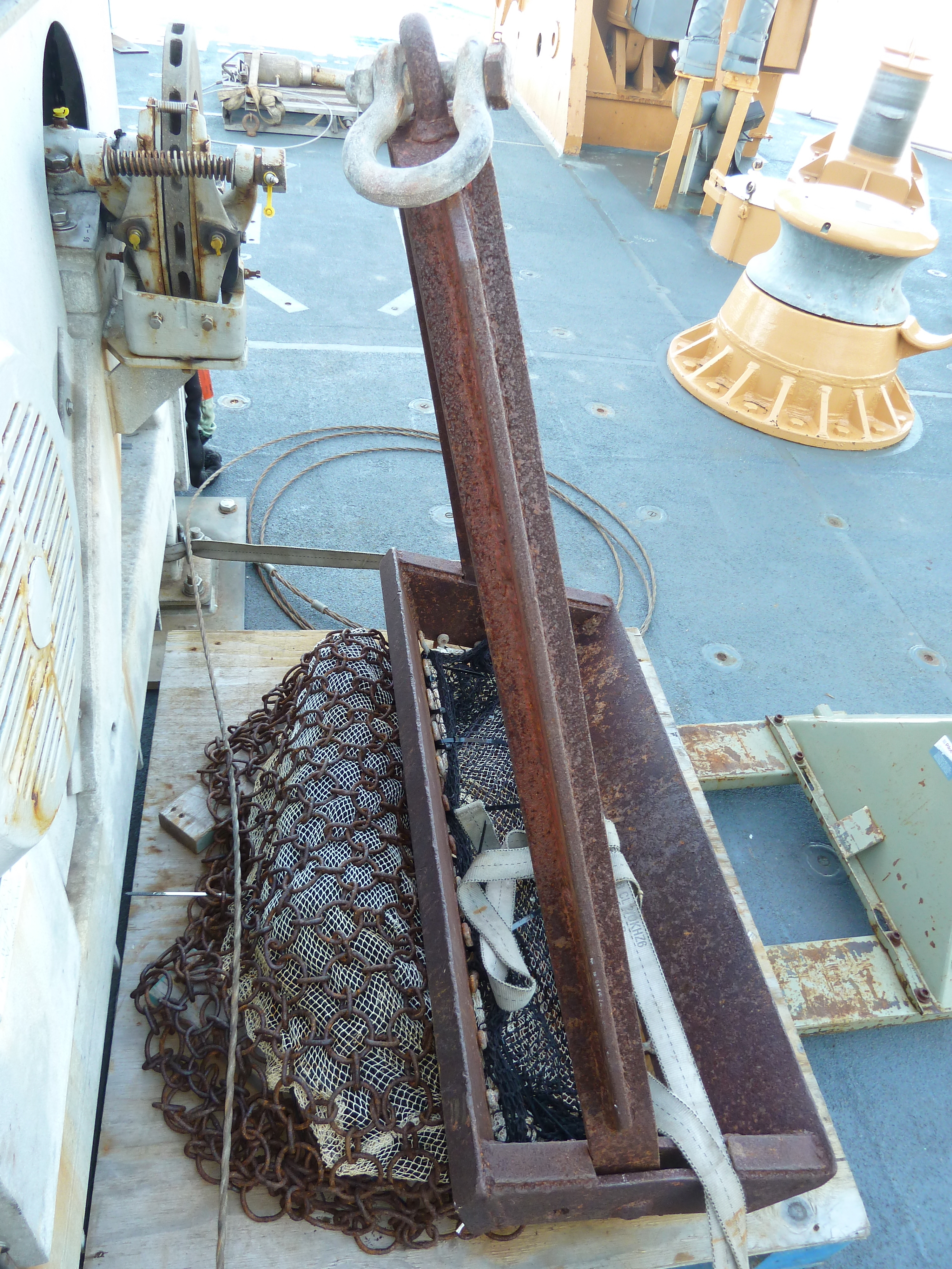 This chain dredge has a heavy mesh liner in the chain for capturing smaller samples that would otherwise slip through the chain. The tradeoff is that it might fill up faster with unwanted mud or sand. Aboard the USCGC Healy icebreaker in the Arctic Ocean.