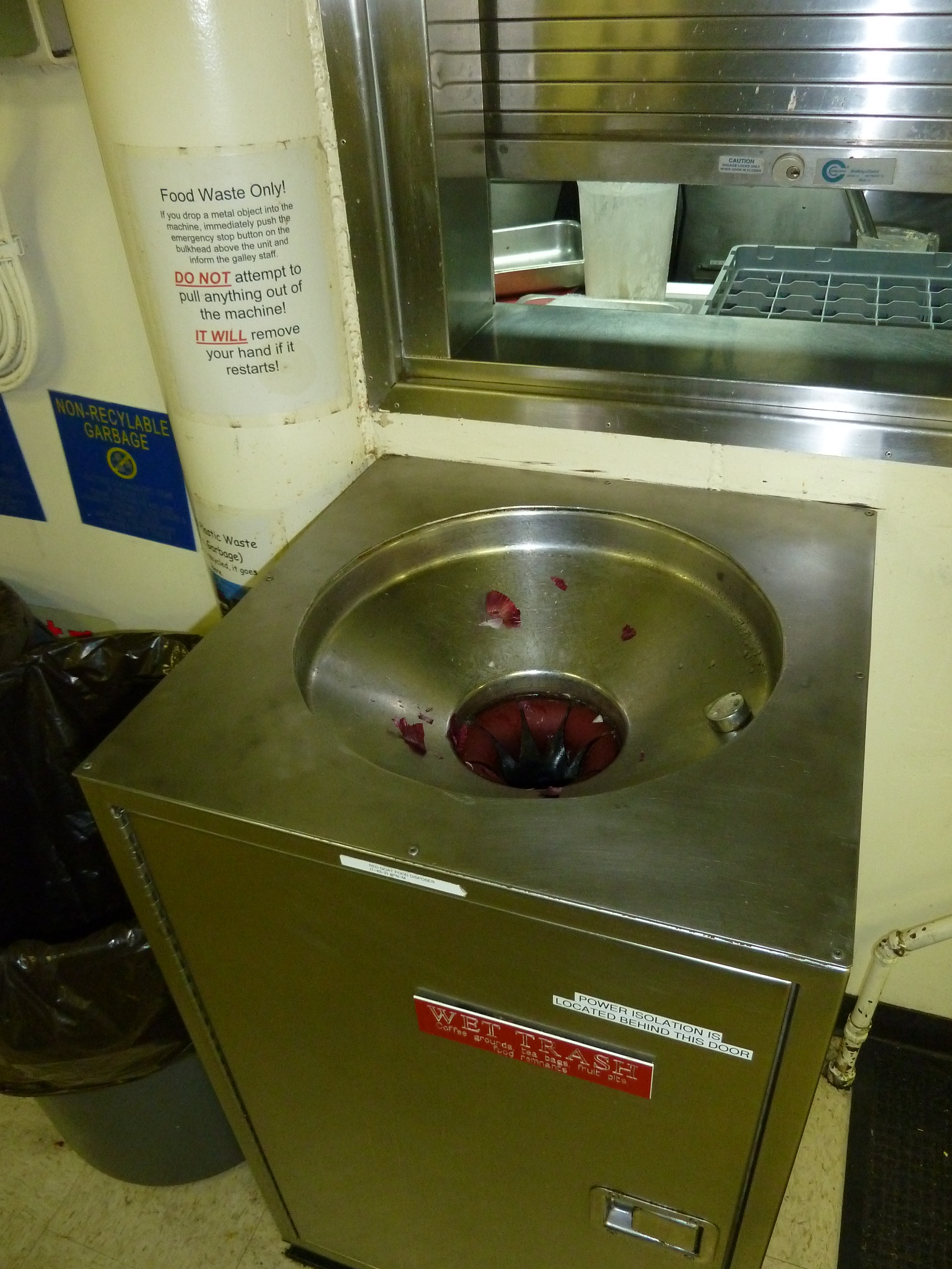 The 'Red Goat' is a giant garbage disposal for food waste in the Healy's galley. Since garbage sometimes has to be stored for months before offloading, the crew doesn't want food that can add volume and get smelly in the trash. Instead, the Red Goat grinds it up and delivers it to the sewage system. Bill Schmoker adds, "it even ground up the carcass of a barbecued pig after the special Coast Guard Day meal!" In the galley, aboard the USCGC Healy icebreaker in the Arctic Ocean.