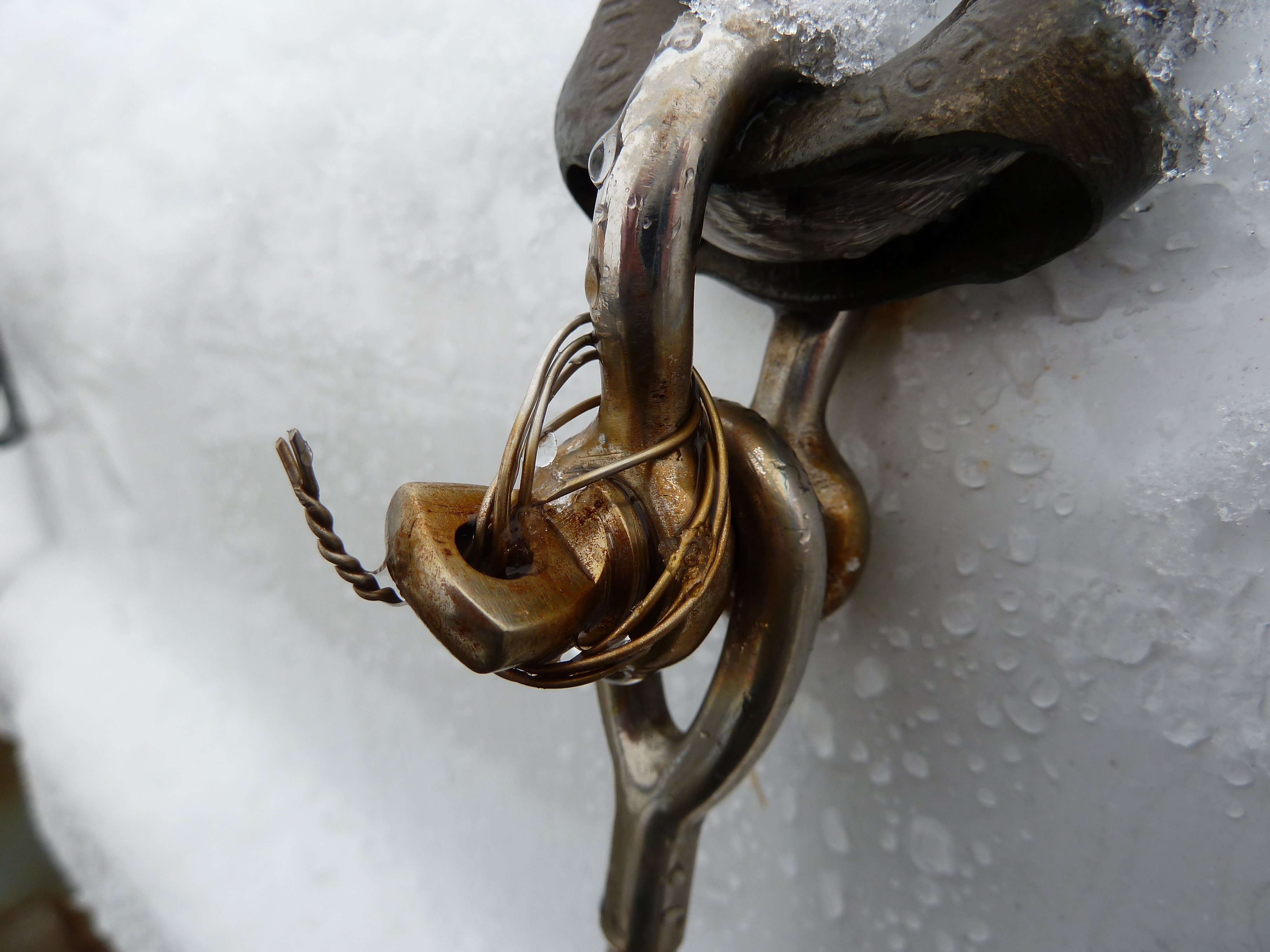 The wire that keeps this shackle pin from loosening and falling out is called 'mousing'. Aboard the USCGC Healy icebreaker in the Arctic Ocean.