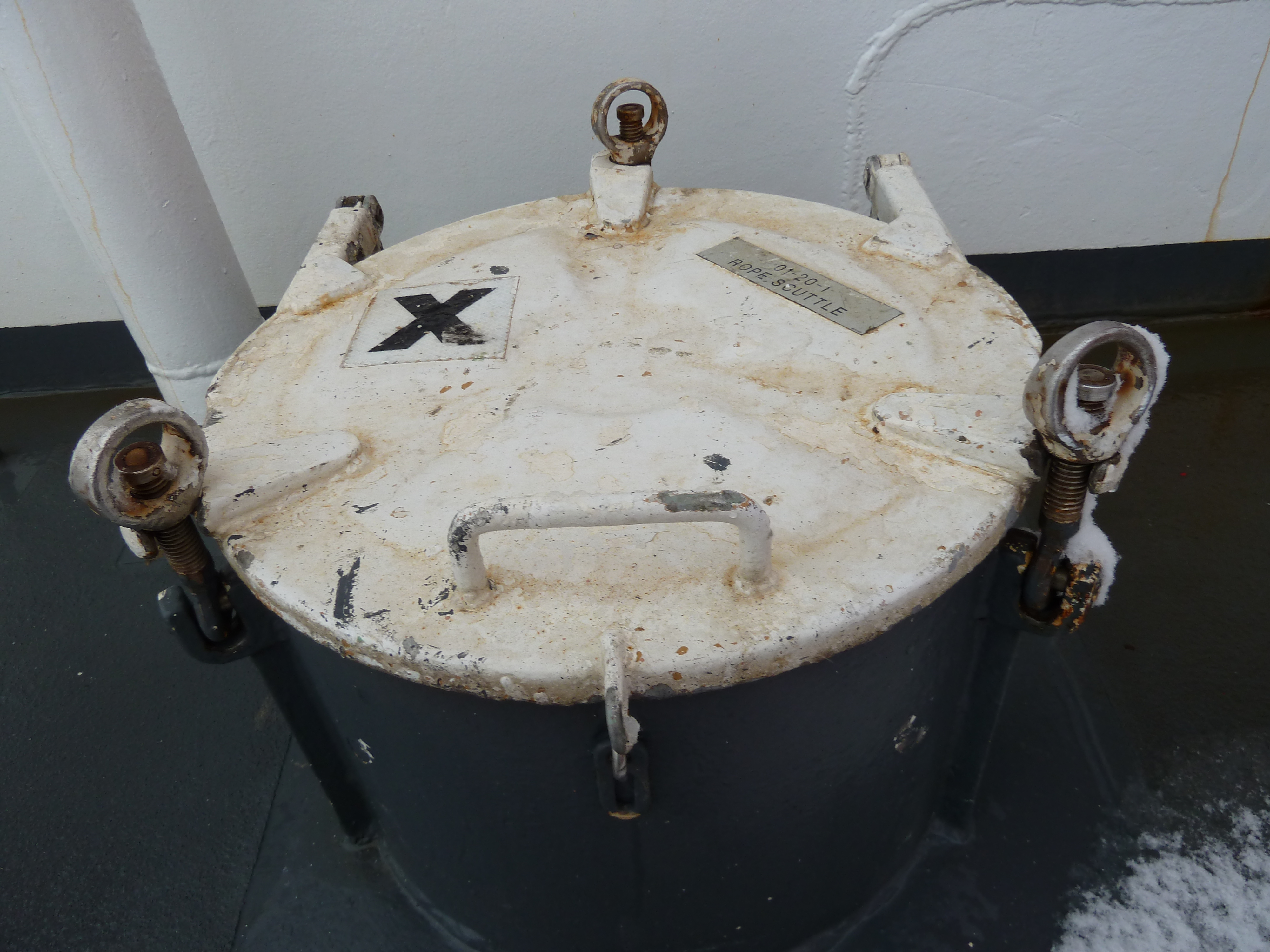 Each of the three threaded toggles used to lock down this scuttle is called a dog. Aboard the USCGC Healy icebreaker in the Arctic Ocean.