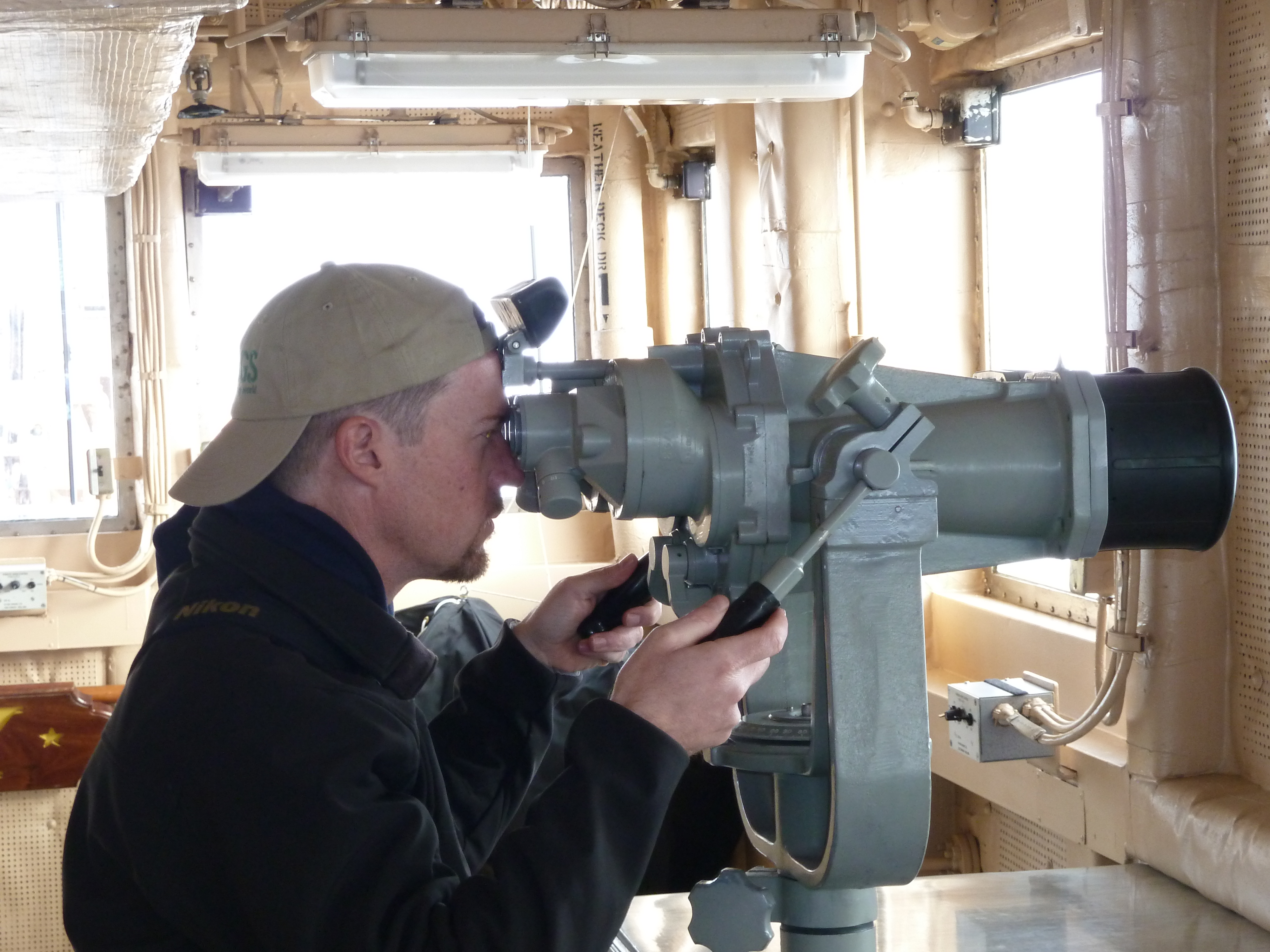 Ever hopeful of another bear, seal, whale, or bird sighting, Bill Schmoker scans the horizon using the port-side "big eyes" on the Healy's bridge. Aboard the USCGC Healy icebreaker in the Arctic Ocean.
