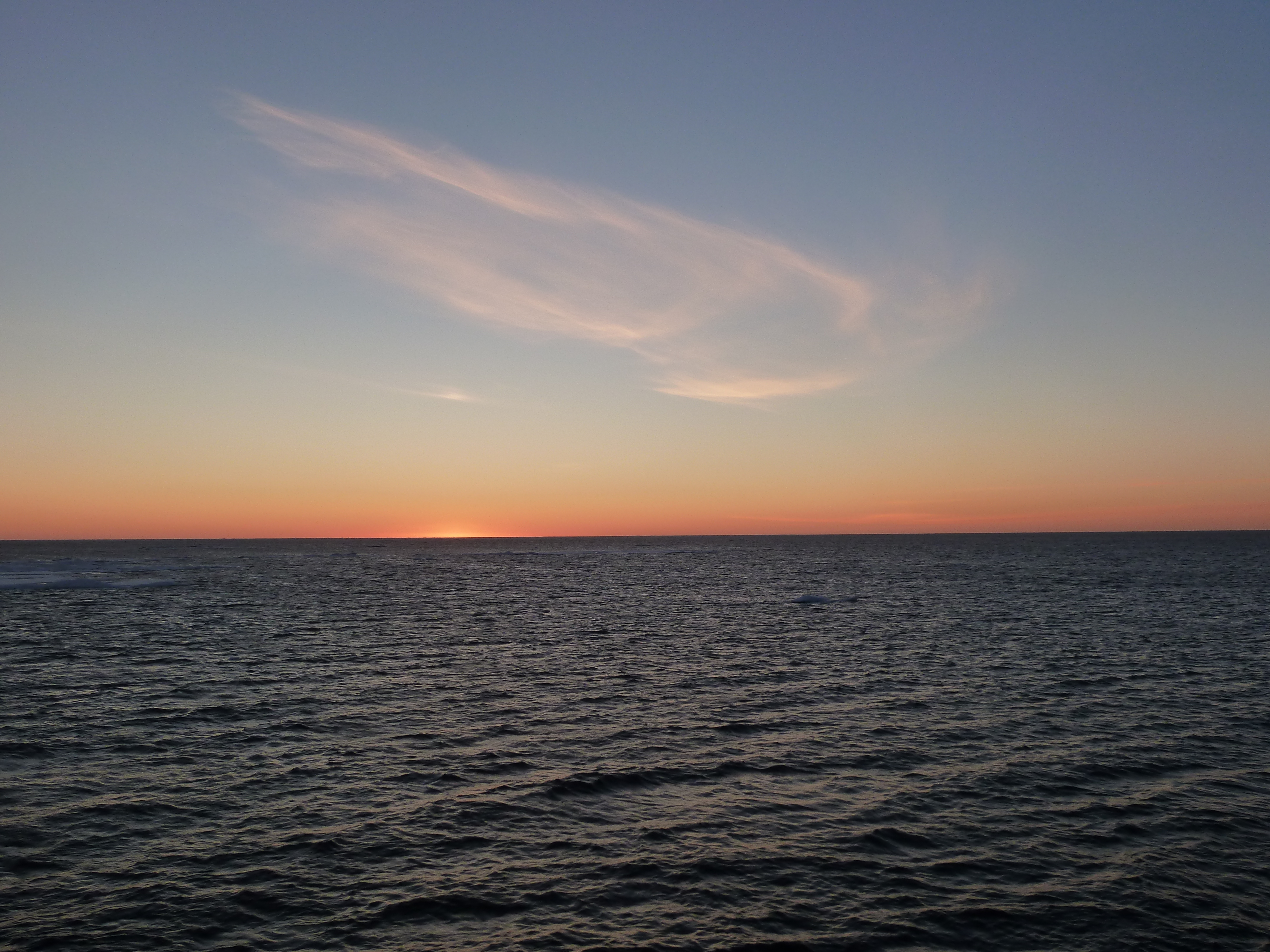 Bill Schmoker: "The first sight after the Sun dipped below the horizon was a pleasing orange glow." Aboard the USCGC Healy icebreaker in the Arctic Ocean.