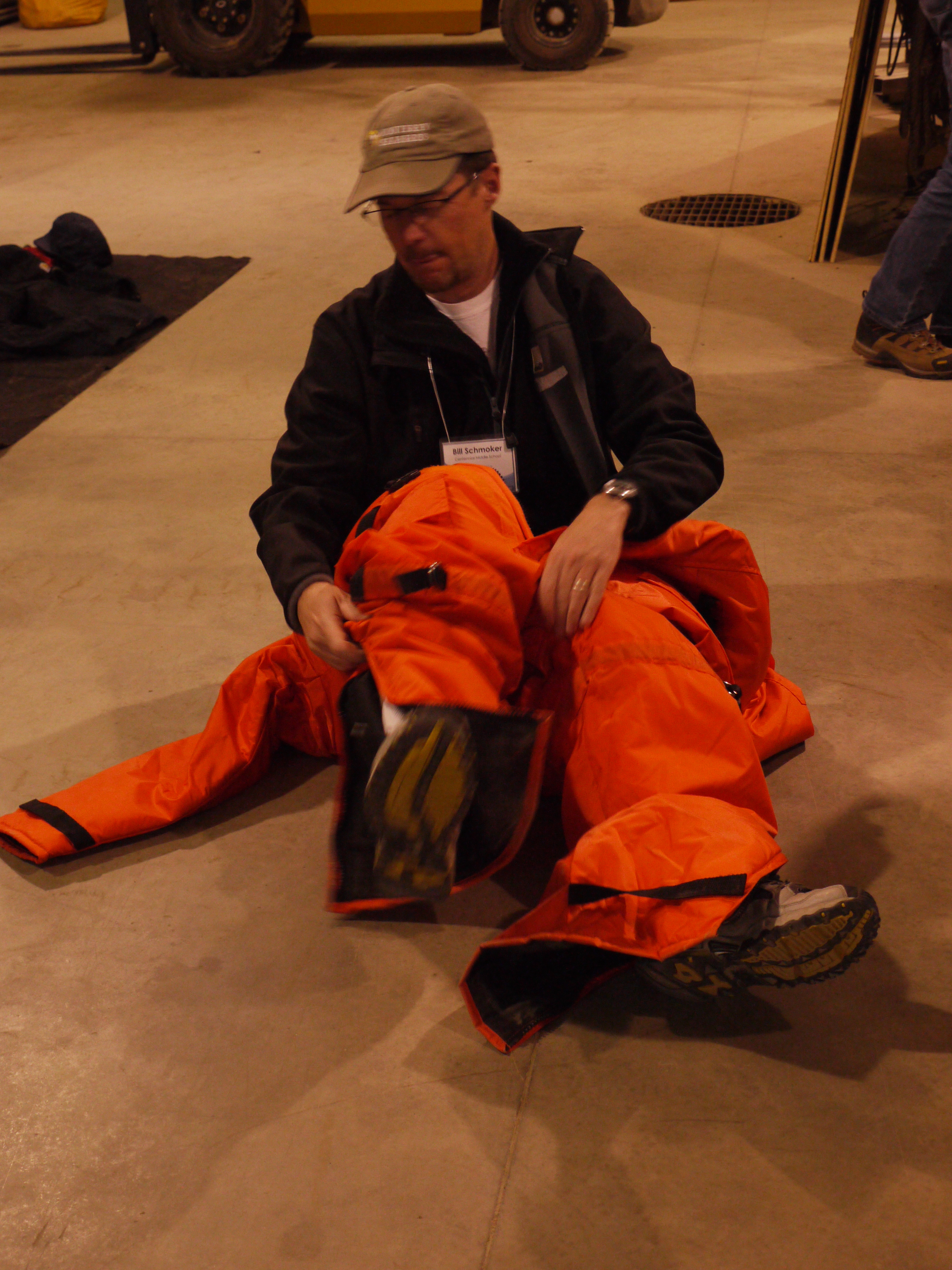 Bill Schmoker tries on a Mustang survival suit at the CH2M Polar Services warehouse in Fairbanks, Alaska.