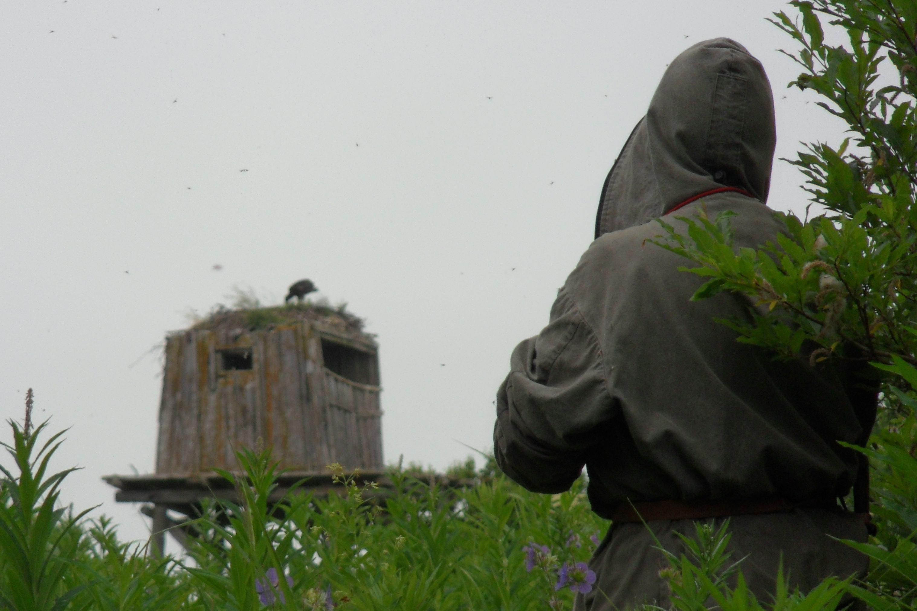Jody Bogeouis stands by with binoculars as the eagle eats its lunch. Stolbevaya, Russia.