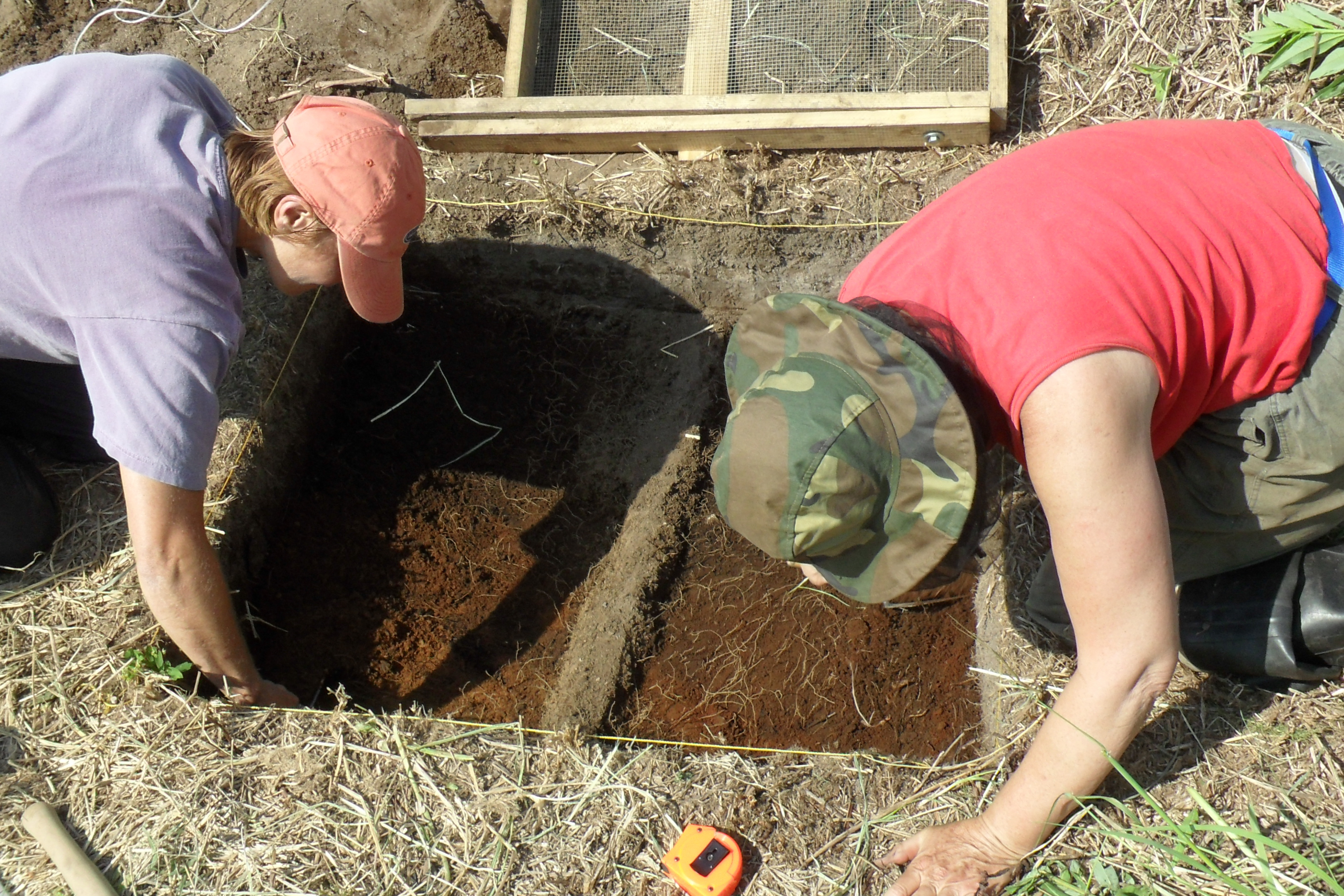 Claude Larson and Jody Bougeois divide the excavation site in half and clean off their area with trowels. Stolbevaya, Russia.