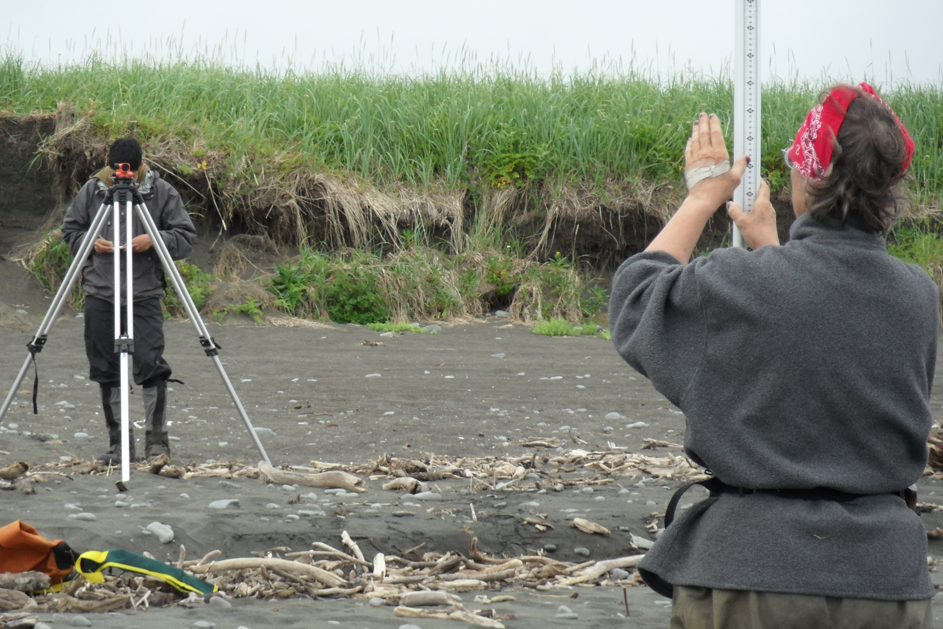 Sean-Paul Le Selle looks through the transit level and Jody Bougeois holds the survey rod on the beach. Stolbevaya, Russia.