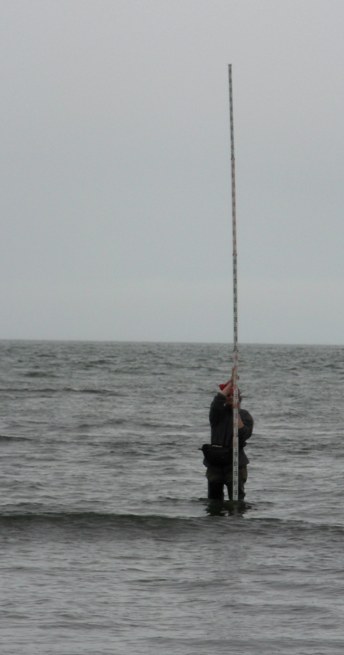 Jody Bougeois stands in the Bering Sea with a survey rod. Stolbevaya, Russia.