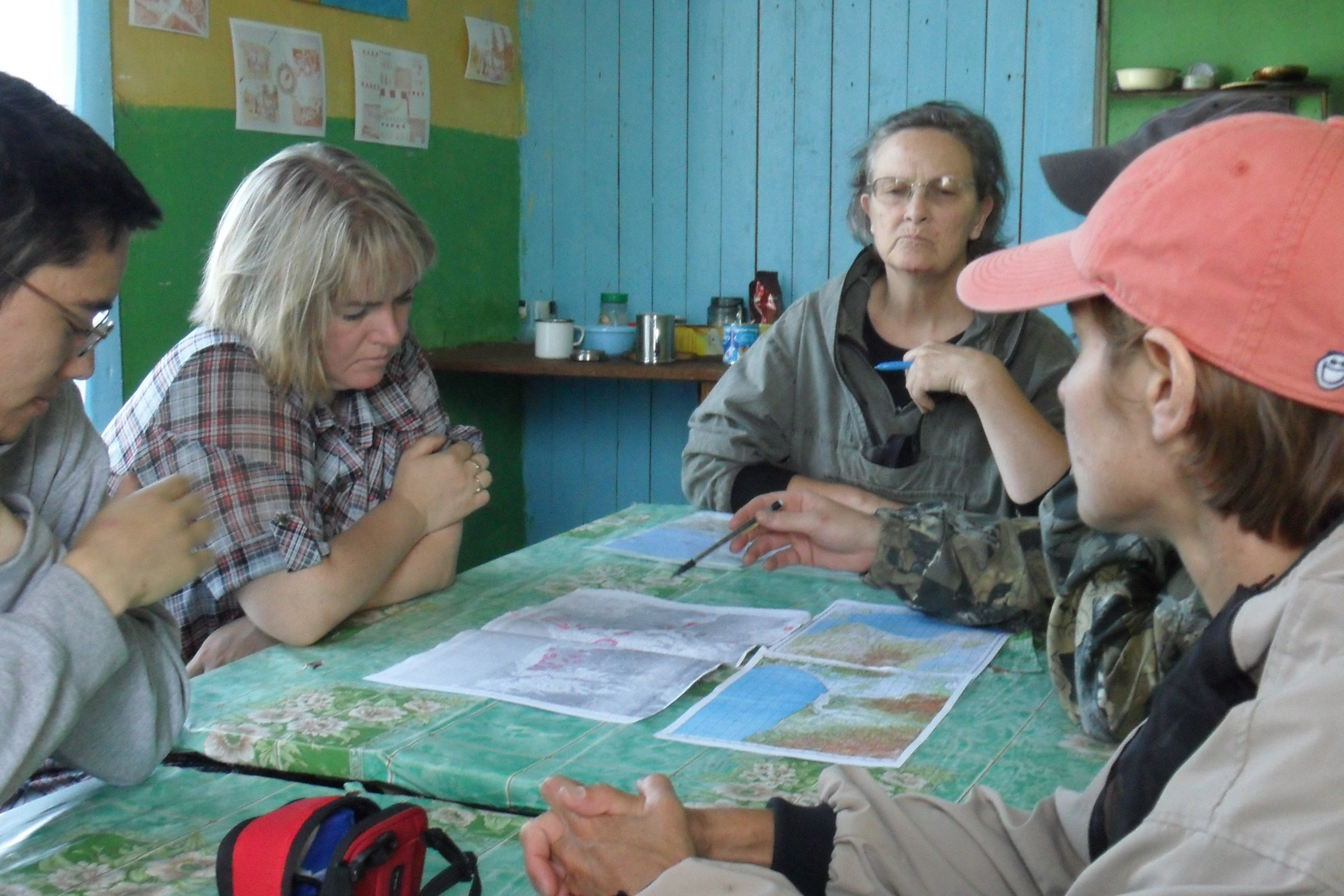 The team has a morning meeting at the breakfast table at Ushki Lake, Russia.