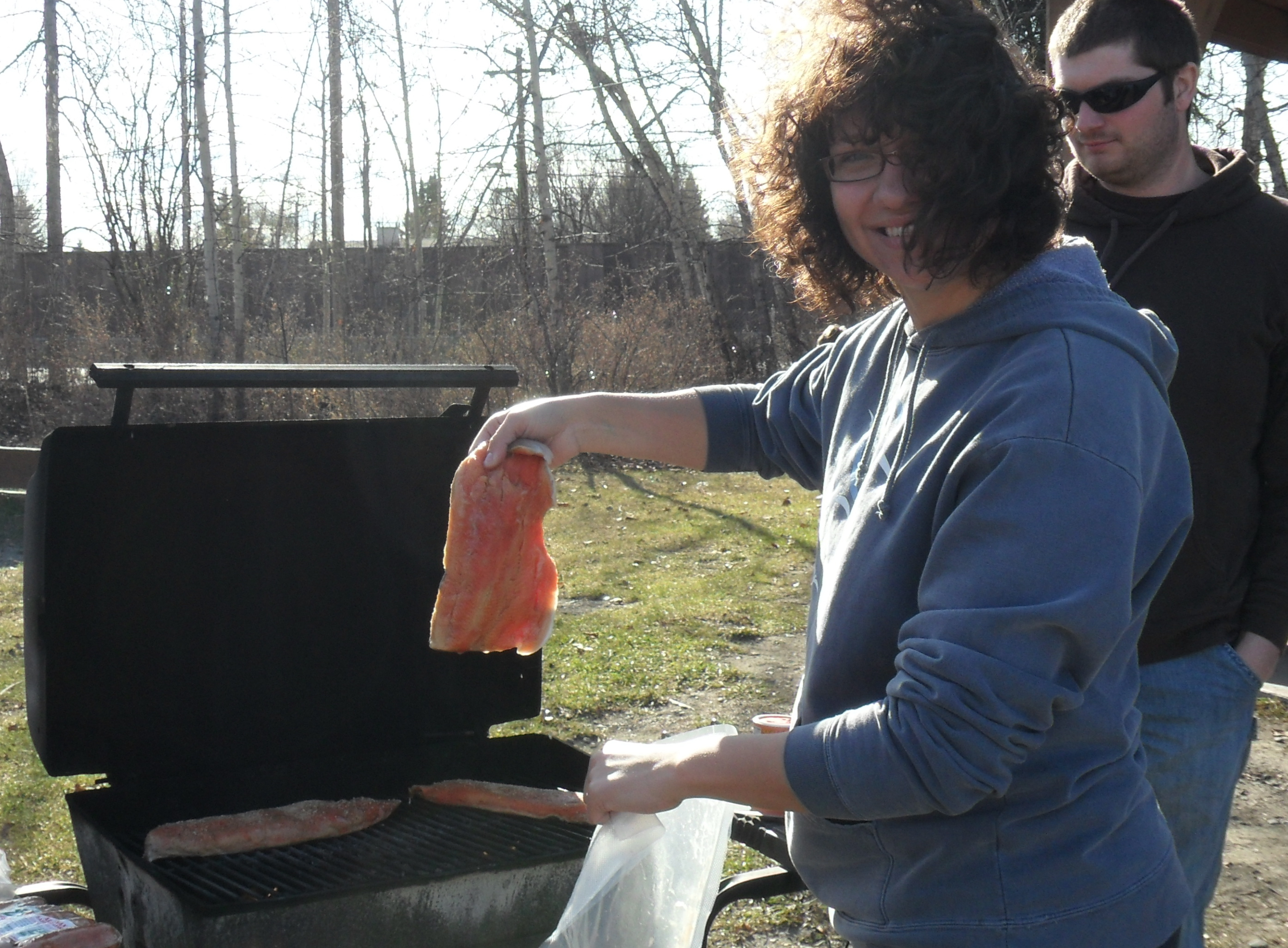 Kristin Timm puts salmon on the BBQ at the PolarTREC orientation potluck dinner. Fairbanks, Alaska.