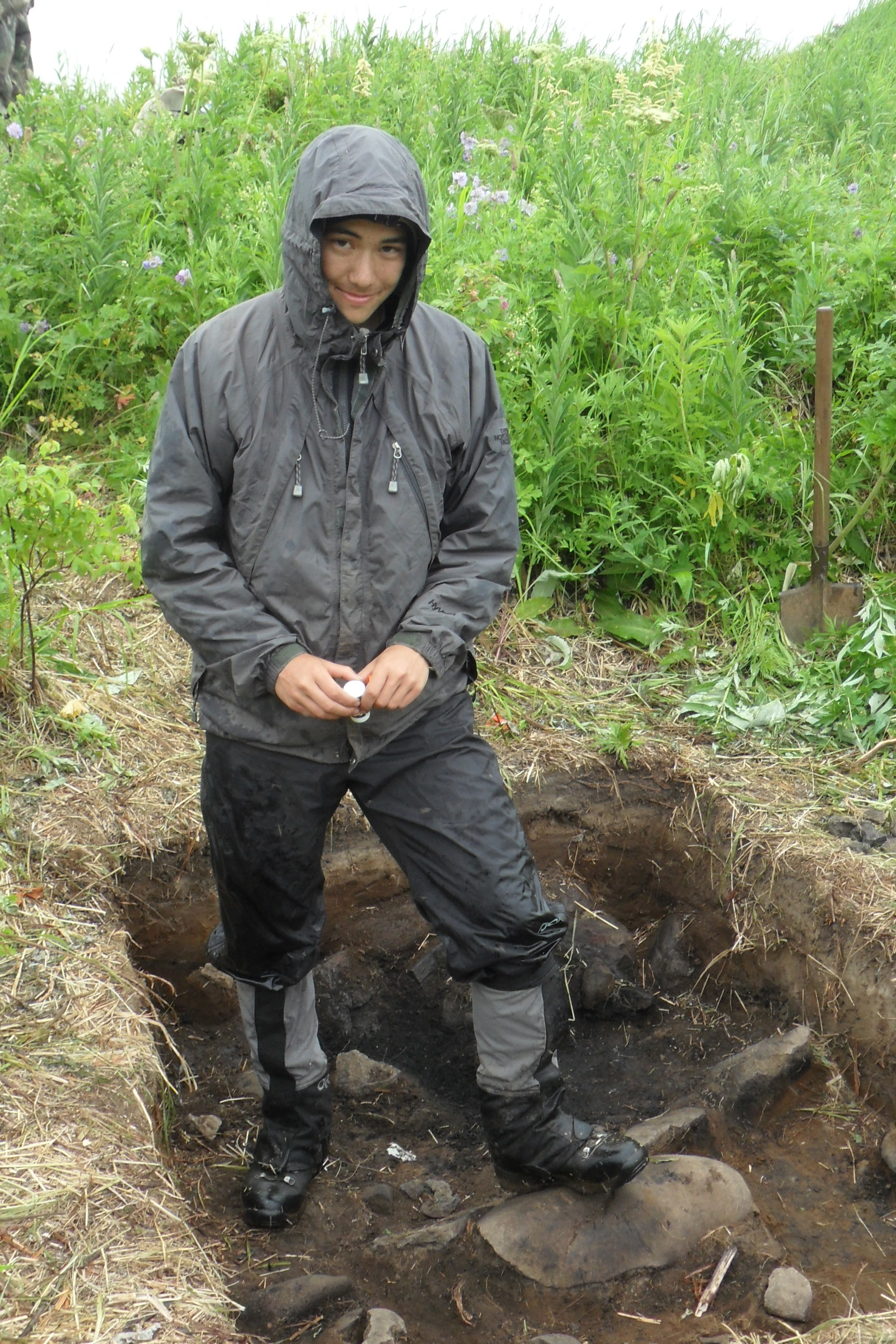 Sean-Paul Le Selle poses in the excavation with the fire hearth. Sean-Paul spent the day before working on the hearth excavation at the first series of depressions. Stolbevaya, Russia.