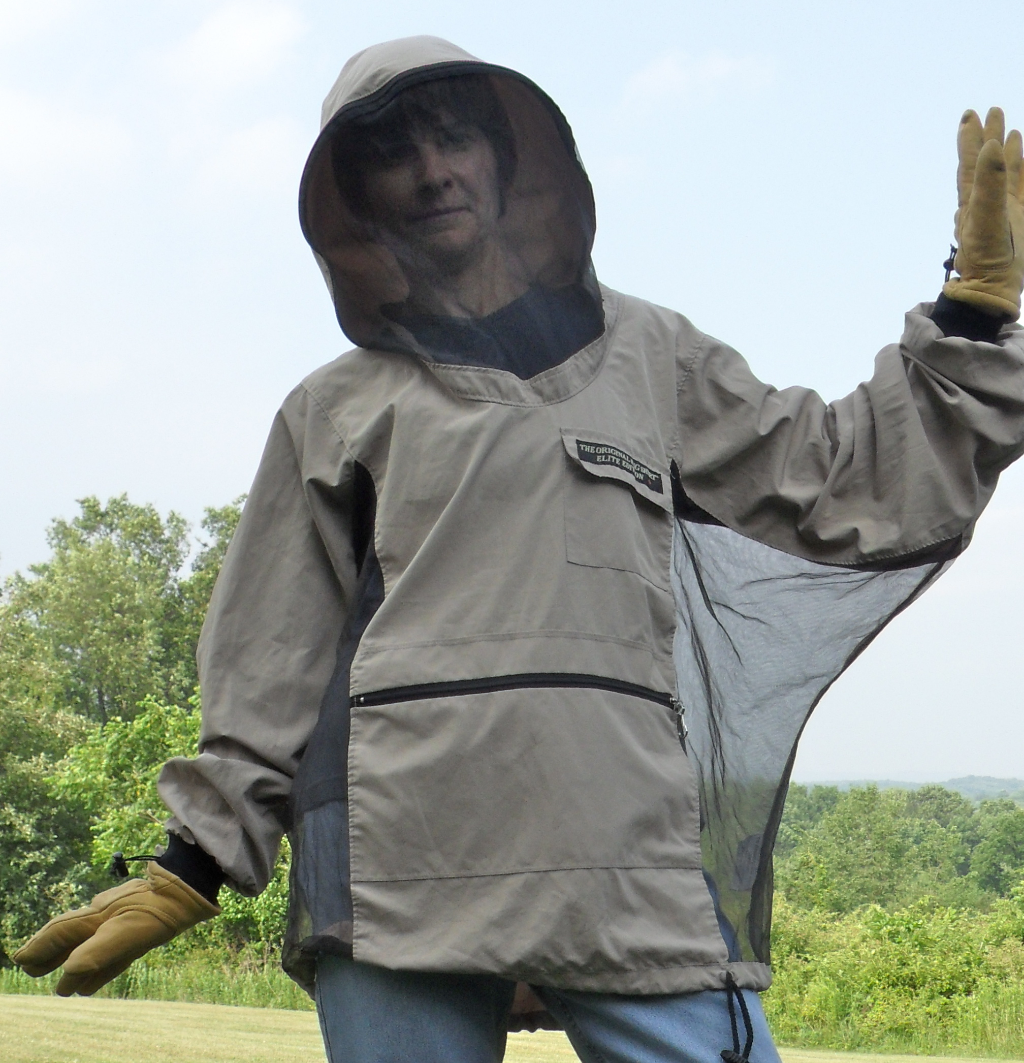 Claude Larson models her bug shirt and leather gloves. At Claude Larson's house in Frankford Township, New Jersey.
