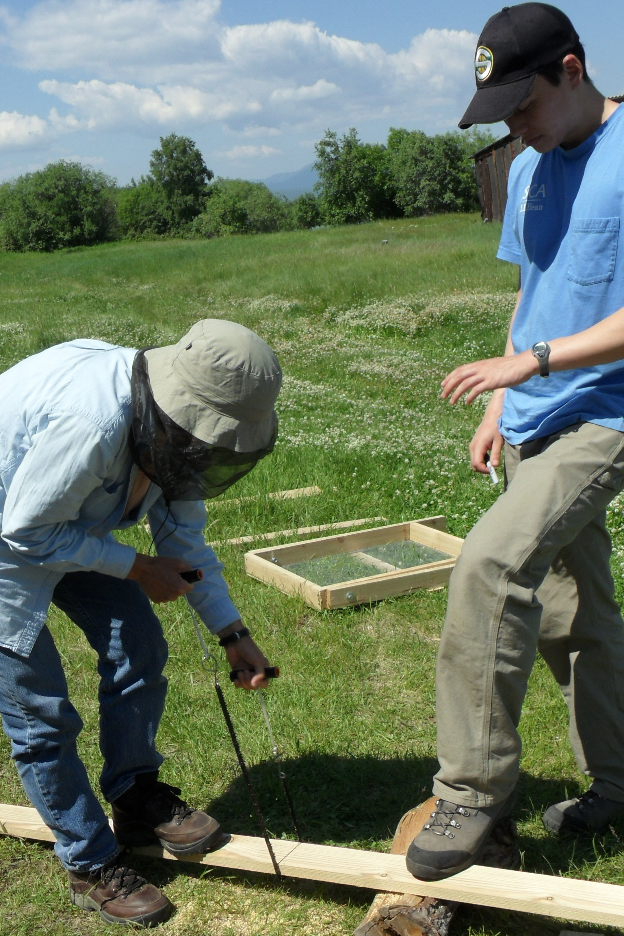 Claude Larson and Sean-Paul Le Selle use the pocket saw at Ushki to make sifting screens. Ushki Lake, Russia.