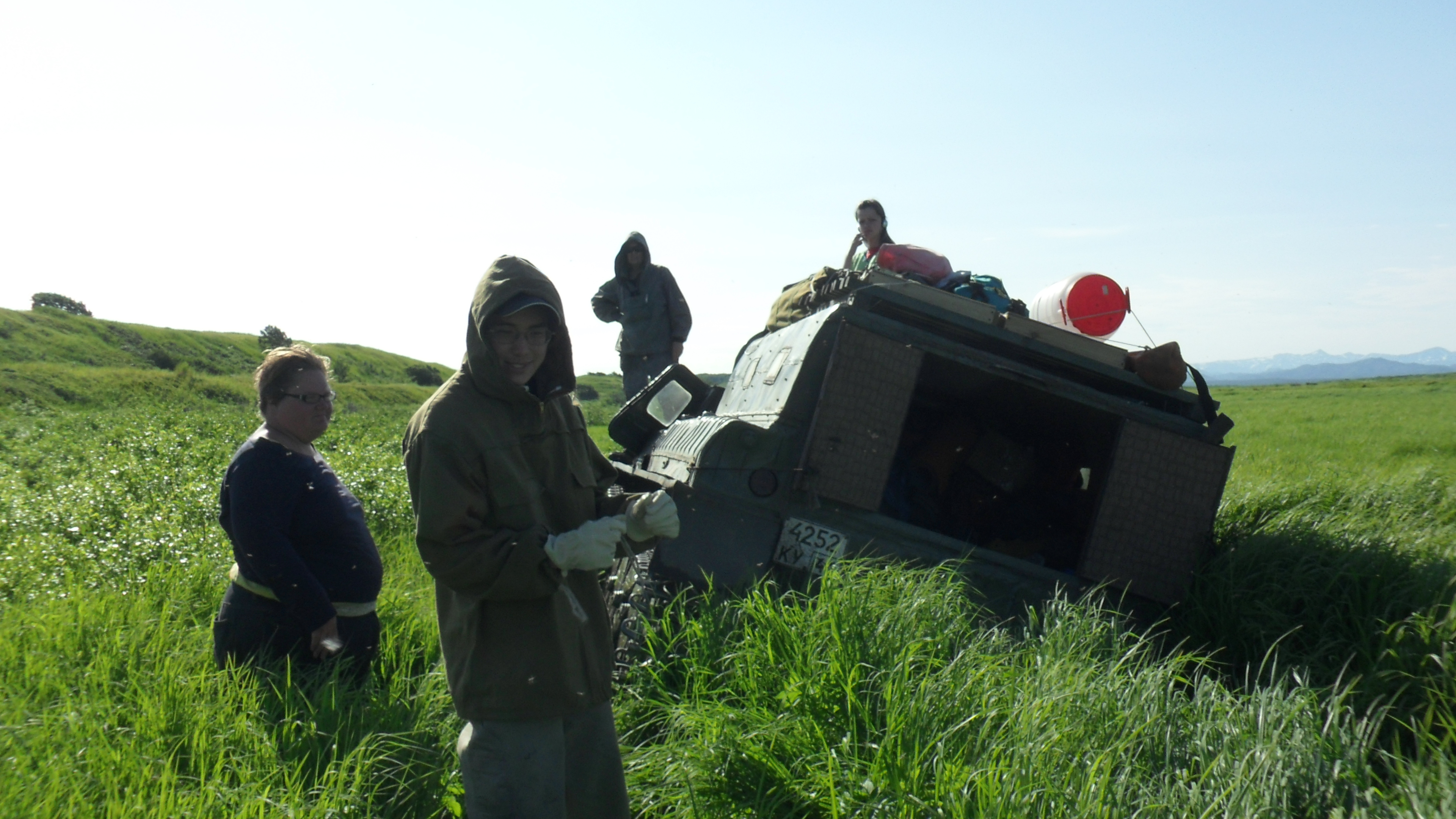The vesdehod tank became stuck in a marsh. The vesdehod driver works to get the vehicle out. Kamchatka Peninsula, Russia.