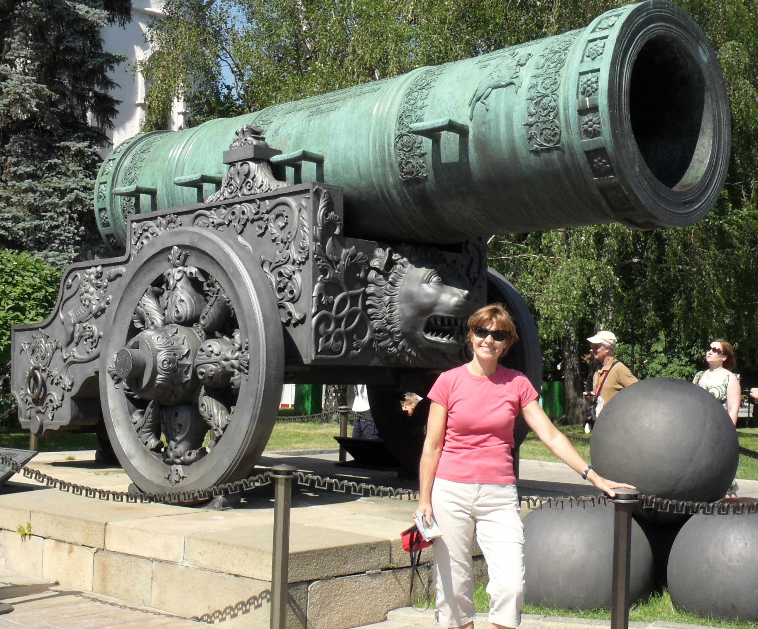 Claude Larson poses by the huge cannon inside the Kremlin Cathedral compound. Red Square, Moscow, Russia.
