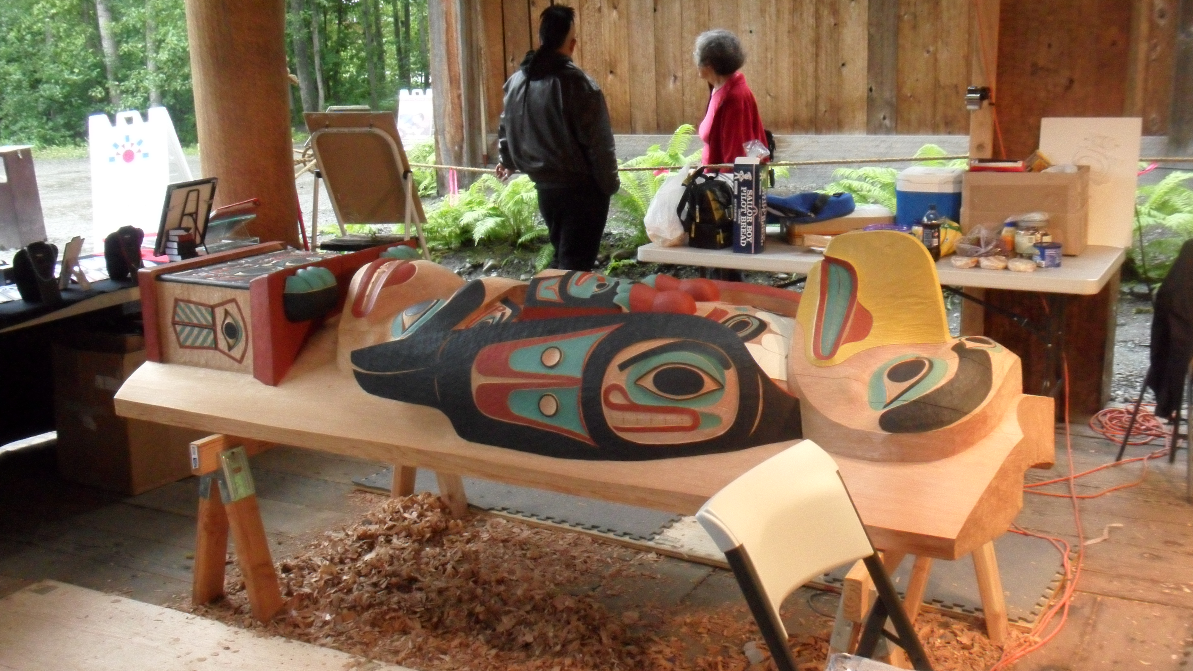 Here a house pole sits waiting to be installed into the cedar lodge. Anchorage, Alaska.
